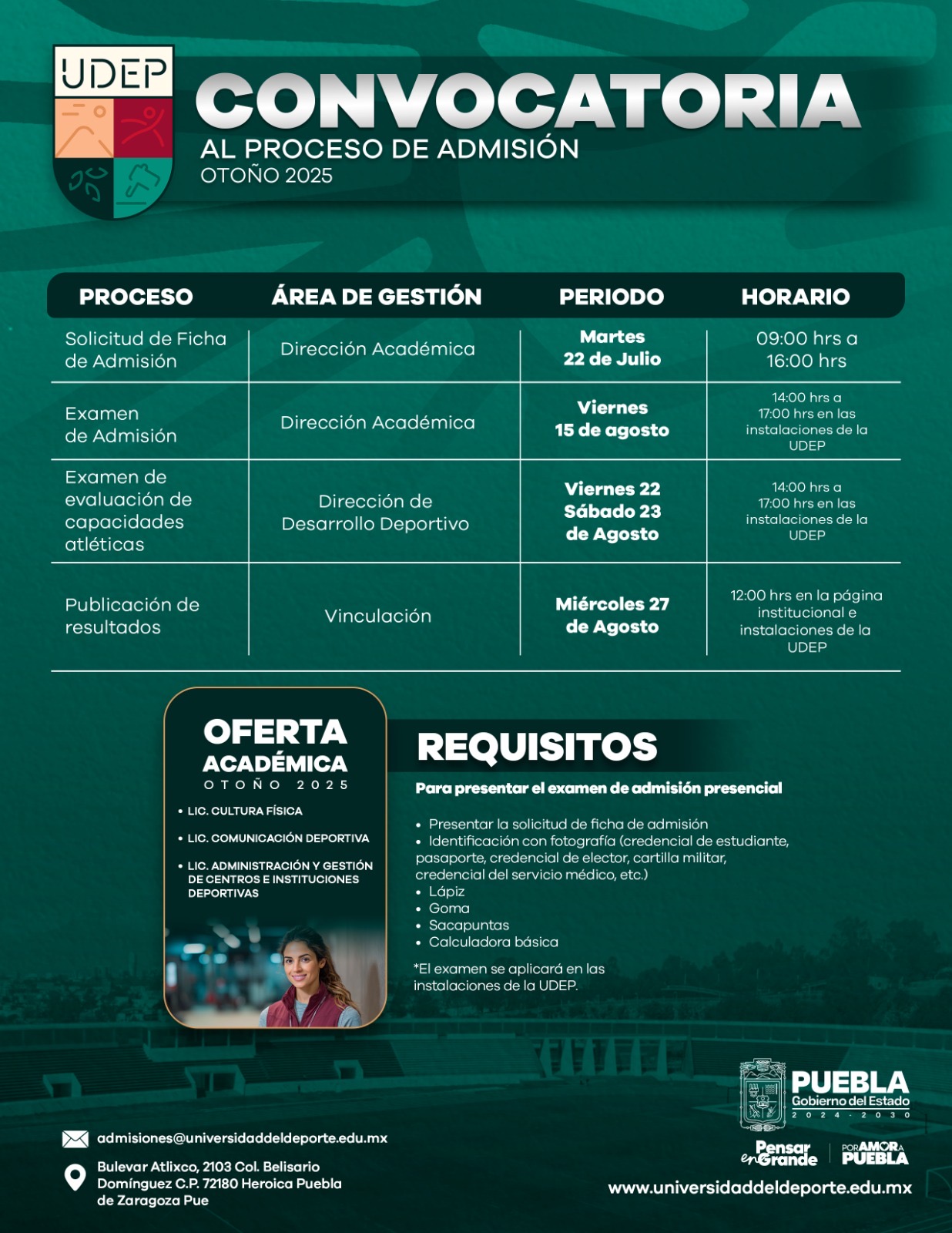 CIUDAD DE PUEBLA.- Como parte de una nueva oferta académica en nivel superior que ha implementado el gobierno del estado que dirige, Alejandro Armenta y con un enfoque de bienestar con seguridad para la juventud, la Universidad del Deporte del Estado de Puebla (UDEP), a cargo del rector, José Luis Sánchez Solá, dio a conocer las fechas de convocatoria y el proceso de admisión a la institución que brindará una formación integral en el deporte y el conocimiento de diferentes disciplinas, con práctica de alto nivel.