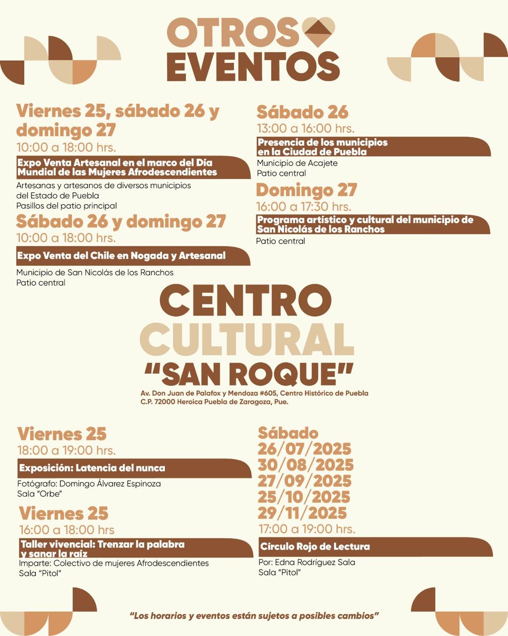 Entre los eventos programados por la Secretaría de Arte y Cultura, se incluye una expo venta artesanal en el marco del Día Mundial de las Mujeres Afrodescendientes, conmemorado el 25 de julio, en la que participarán artesanas y artesanos de diversas localidades del Estado de Puebla. Asimismo, el municipio de San Nicolás de los Ranchos expondrá y comercializará Chiles en Nogada y artesanías y desarrollará un programa artístico y cultural para las y los asistentes.