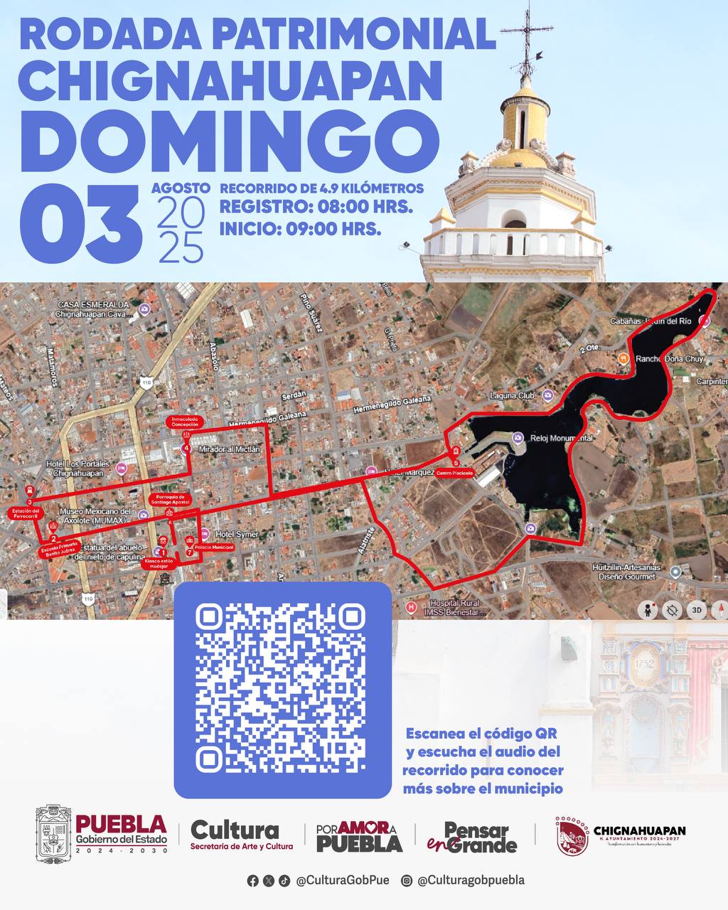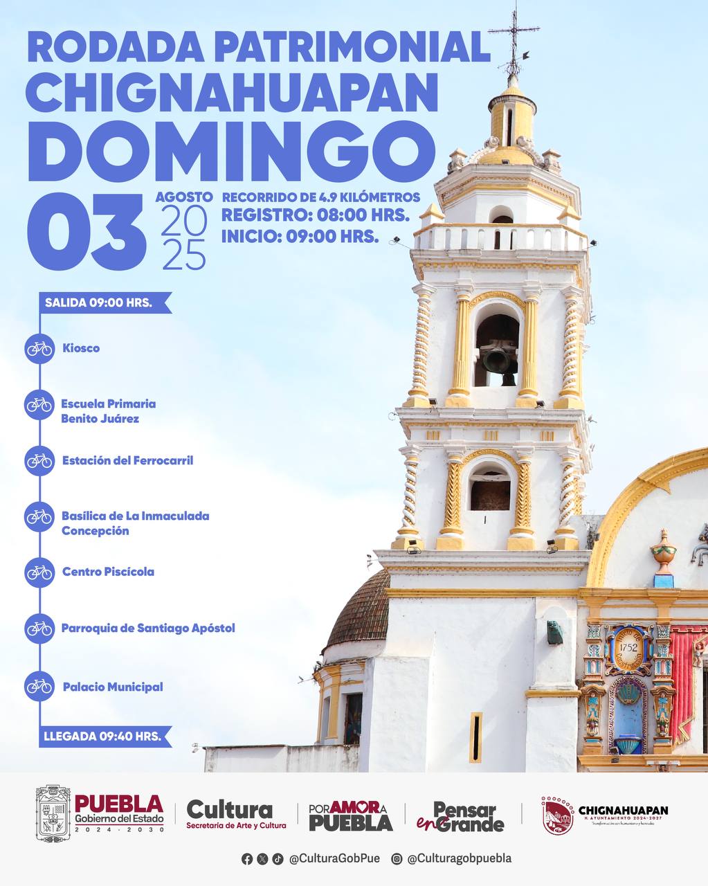 CIUDAD DE PUEBLA, Pue.- El Gobierno del Estado de Puebla continúa con las Rodadas Patrimoniales en los municipios, bajo el compromiso de impulsar el bienestar social y la cultura de las regiones poblanas. Este domingo 03 de agosto, se realizará en Chignahuapan, donde el registro de las y los participantes iniciará a partir de las 08:00 horas.