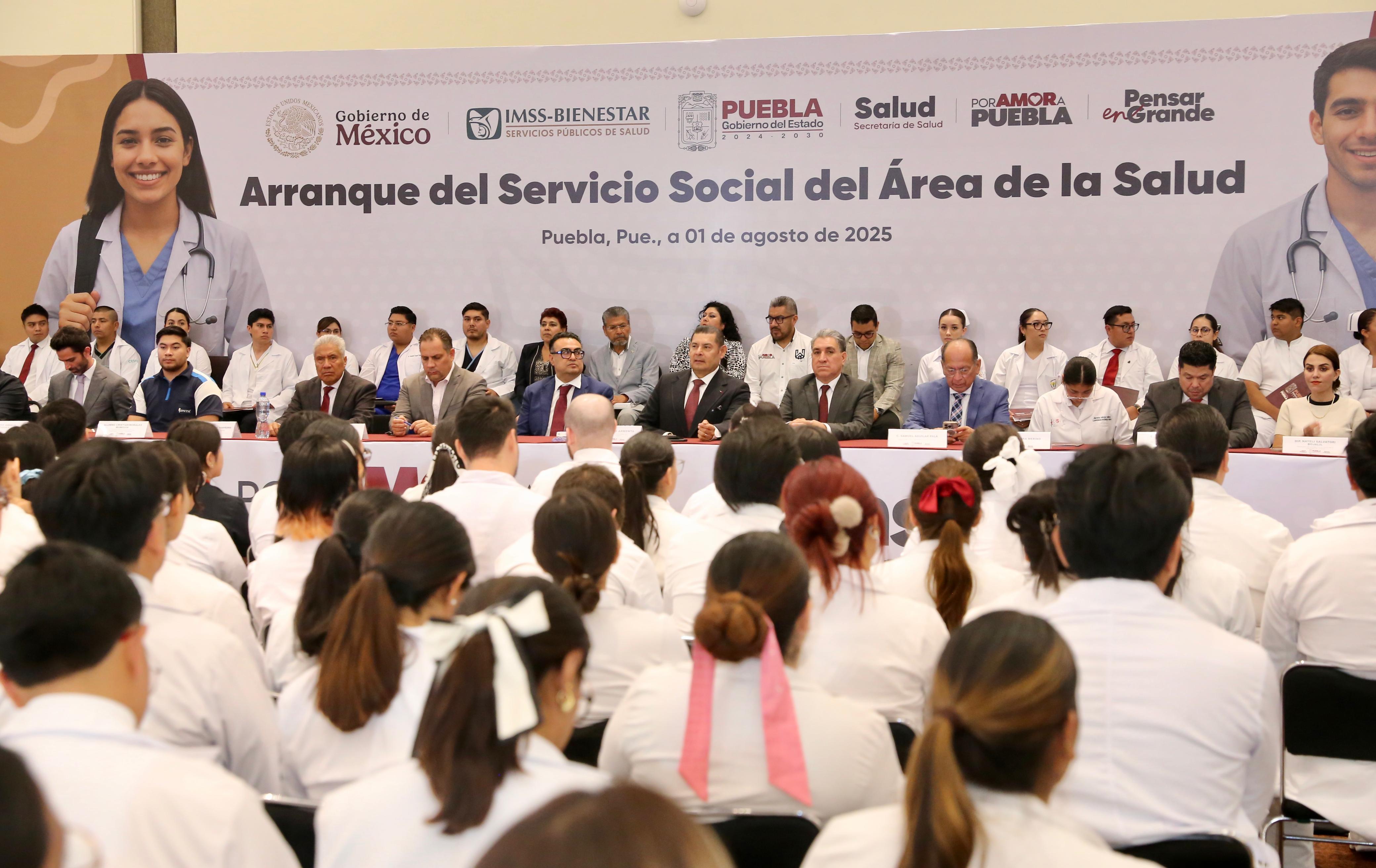 CIUDAD DE PUEBLA, Pue.- El gobernador de Puebla, Alejandro Armenta, encabezó el arranque oficial del Servicio Social del Sector Salud, donde más de 4 mil estudiantes de más de 150 instituciones educativas iniciarán su formación profesional en hospitales y unidades médicas de todo el estado, gracias al convenio entre el Gobierno del Estado y el IMSS-Bienestar.