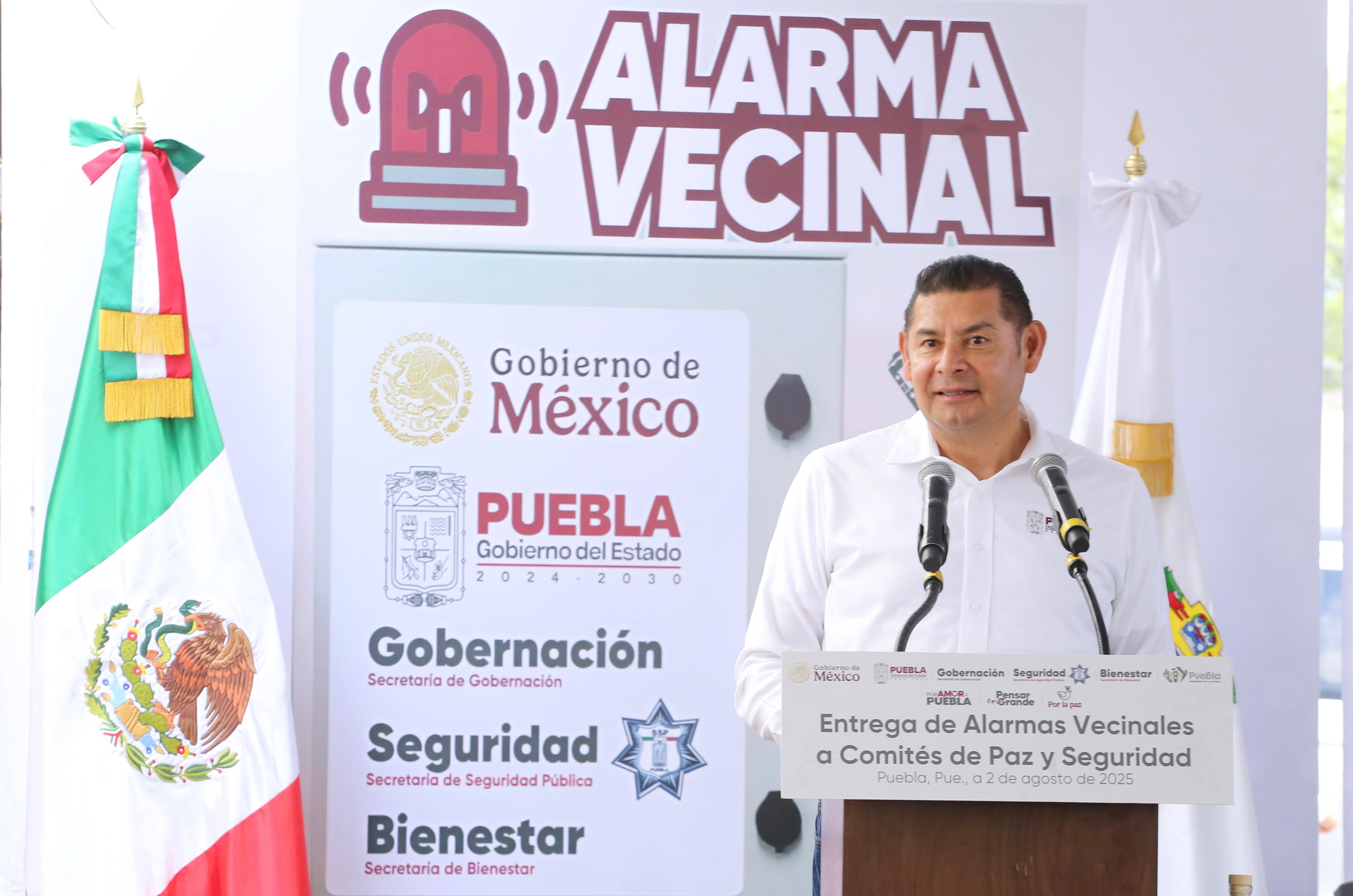 CIUDAD DE PUEBLA, Puebla.- "Ningún gobierno puede sustituir la capacidad organizativa de la sociedad", aseguró el gobernador de Puebla, Alejandro Armenta, al entregar 100 alarmas vecinales a Comités de Paz y Seguridad en la junta auxiliar San Felipe Hueyotlipan.