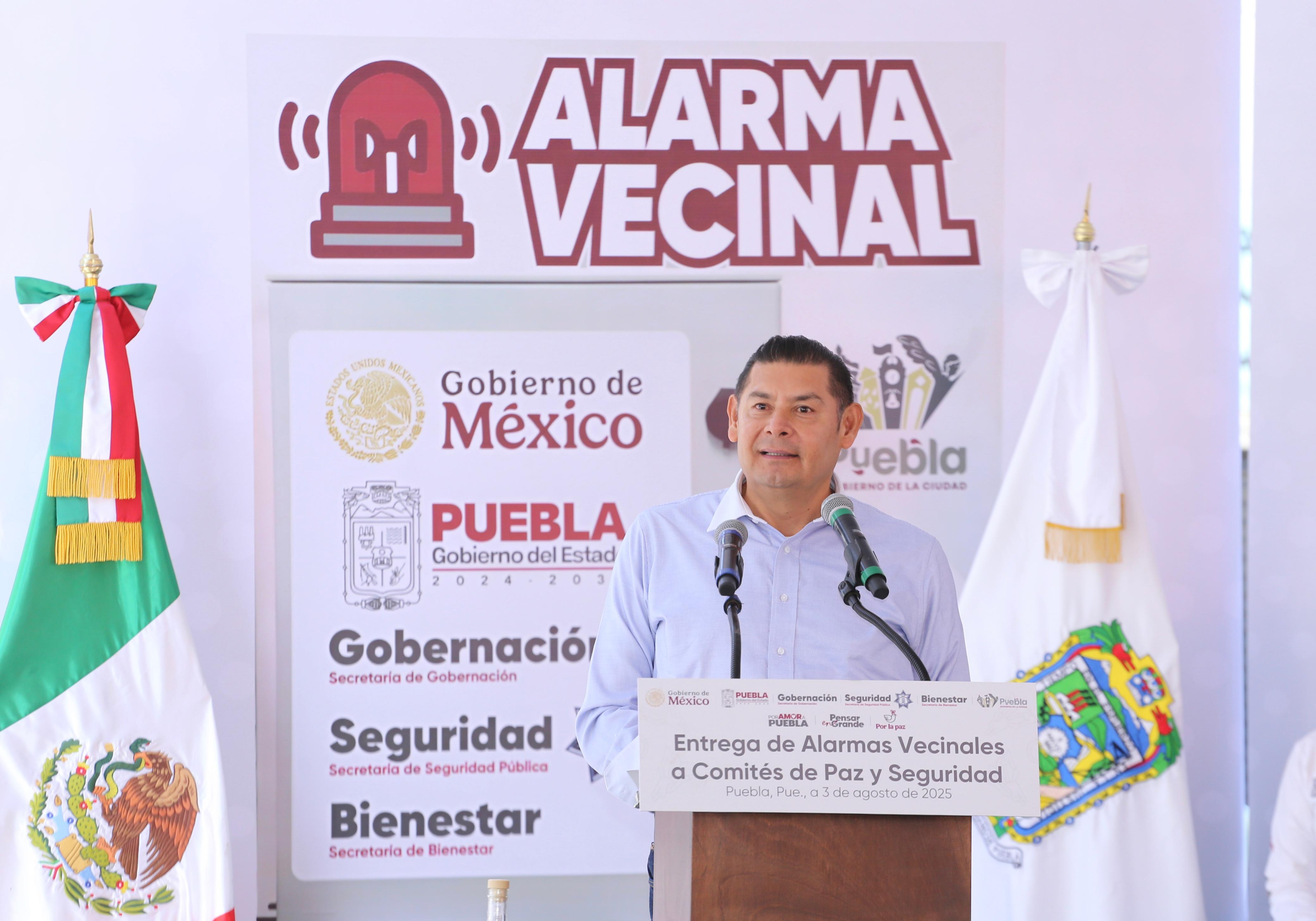 CIUDAD DE PUEBLA, Pue.- Con la visión de transformar los espacios públicos en entornos de paz, tranquilidad y bienestar, el gobernador de Puebla, Alejandro Armenta, entregó 100 Alarmas a Comités de Paz y Seguridad en la junta auxiliar San Baltazar Campeche, donde aseguró que dichos comités son guardianes y colaboradores del gobierno. "Nuestra prioridad es proteger a las y los poblanos", afirmó.
