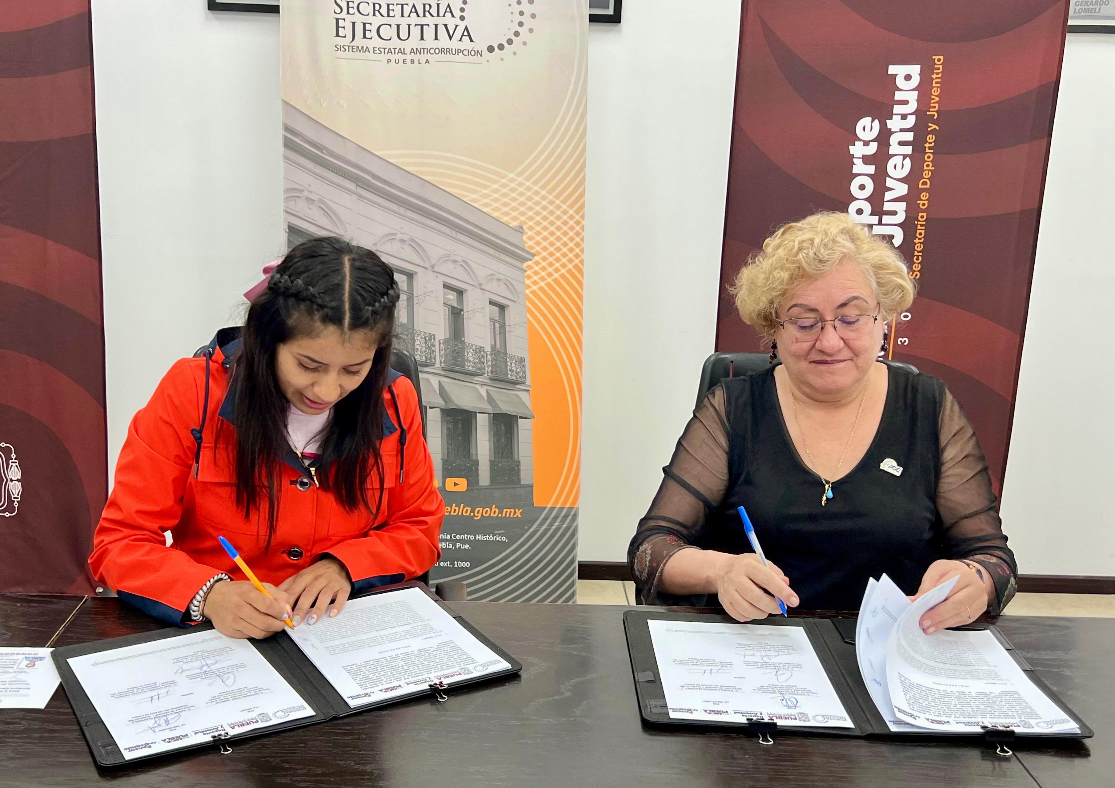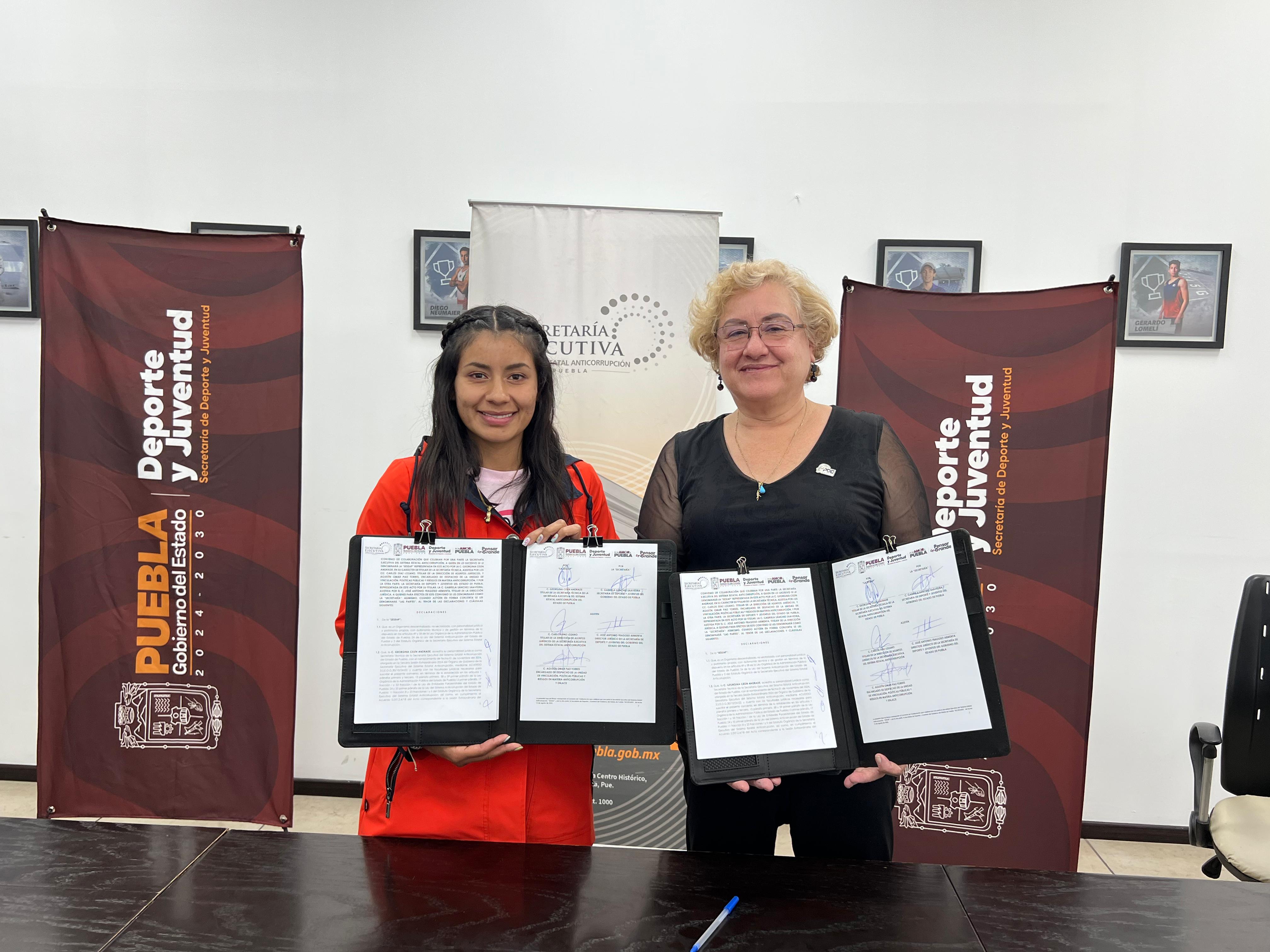 Las oficinas de la Secretaría de Deporte y Juventud fueron la sede de la firma de convenio entre su titular, Gaby “La Bonita” Sánchez, y la secretaria técnica de la Secretaría Ejecutiva del Sistema Estatal Anticorrupción (SESEAP), Georgina Cesín Andrade, quien destacó la importancia de generar alianzas estratégicas que contribuyan a fortalecer las capacidades de ambas dependencias.