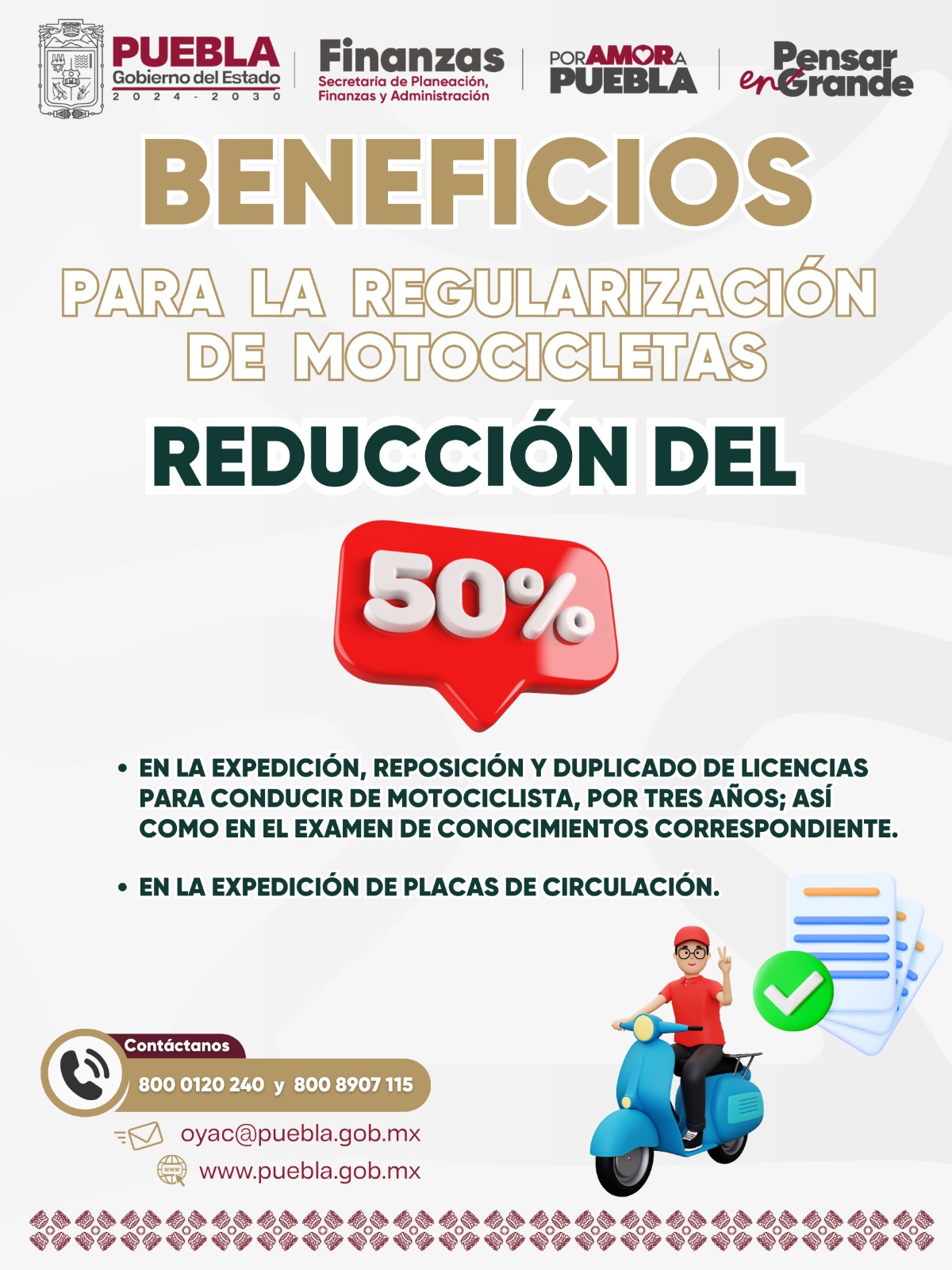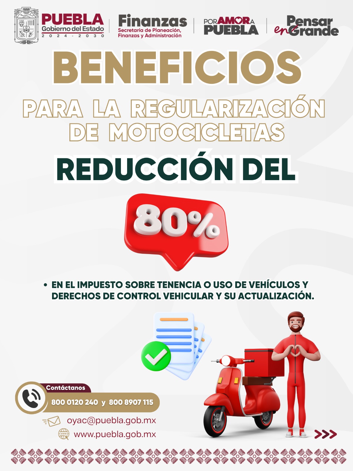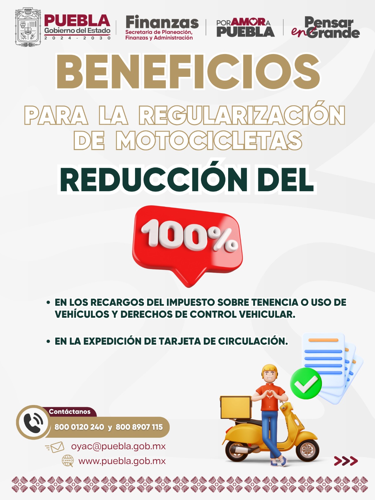 CIUDAD DE PUEBLA, Pue.- Con la finalidad de que las propietarias y los propietarios de motocicletas puedan cumplir con las disposiciones fiscales, el Gobierno del Estado de Puebla, a través de la Secretaría de Planeación Finanzas y Administración, ha implementado diversas acciones para la regularización de estas unidades, que consisten en la reducción parcial del pago de las siguientes contribuciones: