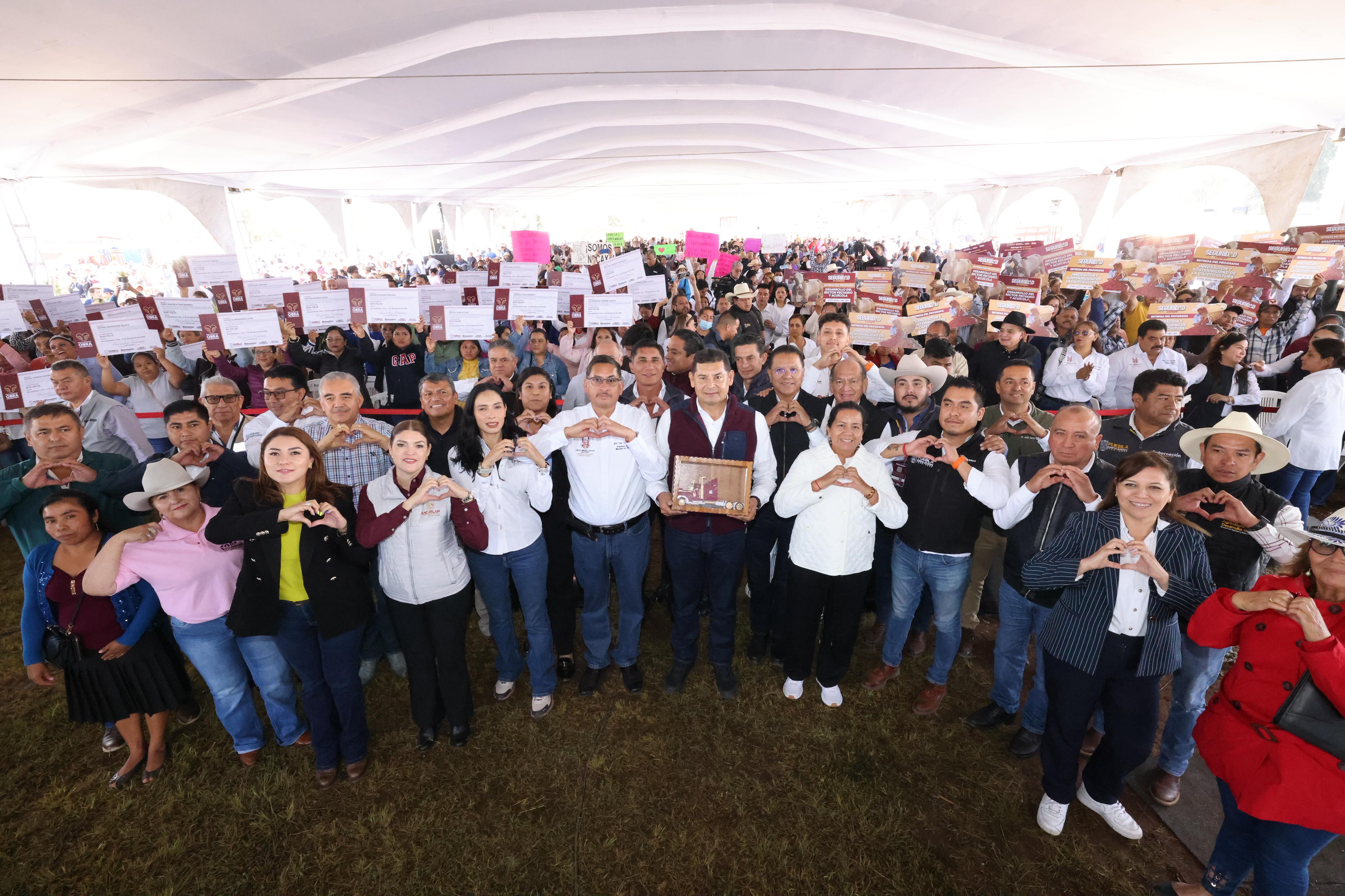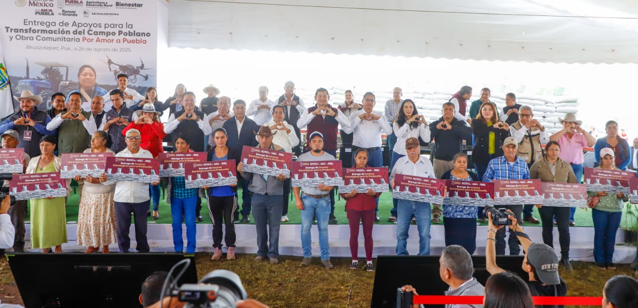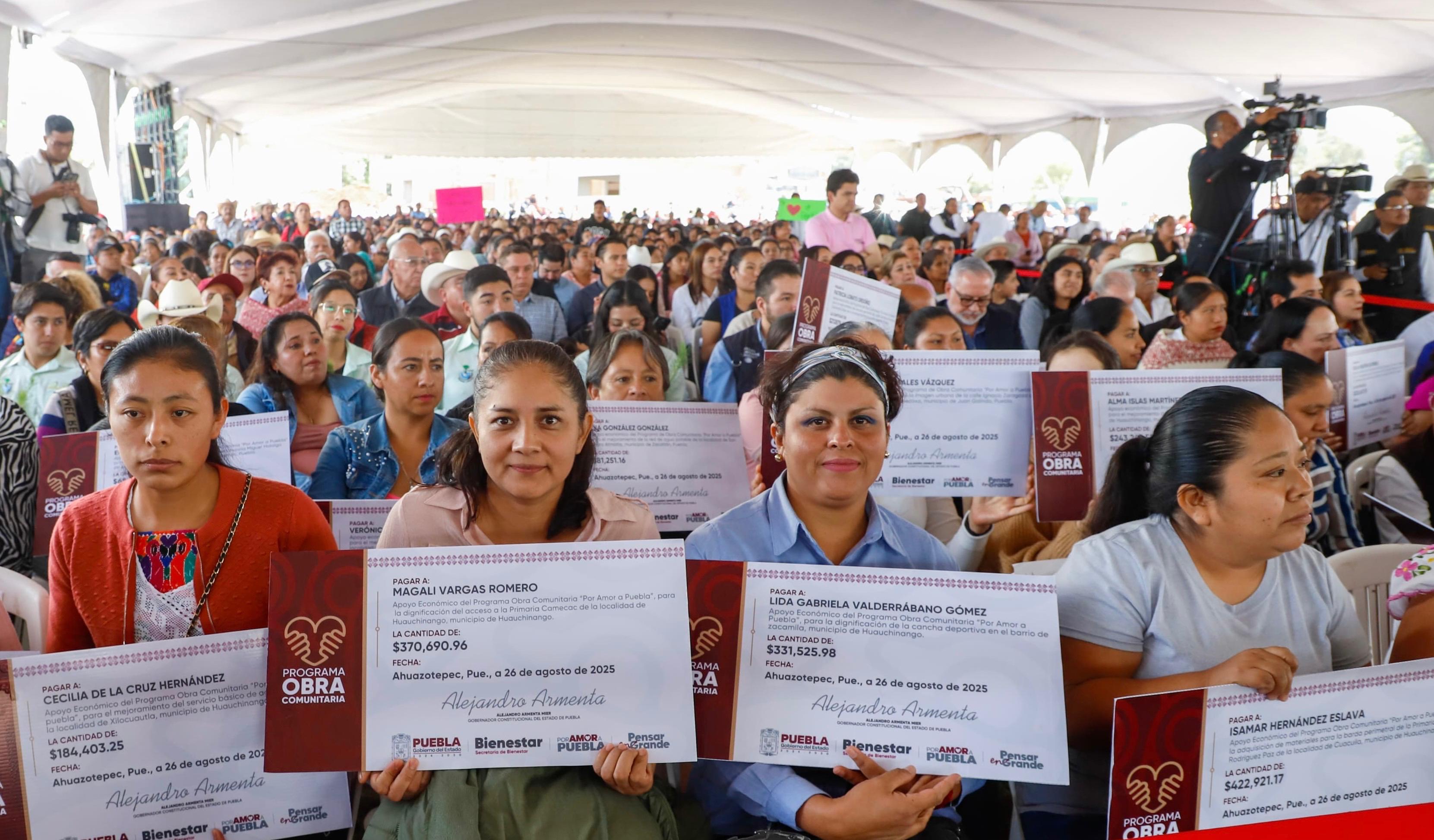 AHUAZOTEPEC, Pue.- El gobernador Alejandro Armenta encabezó la entrega de acciones del programa de obra comunitaria “Por Amor a Puebla”, consolidado como una herramienta clave para reconstruir el tejido social, fomentar la paz y generar bienestar en las comunidades. En esta jornada se entregaron de manera directa y sin intermediarios, insumos, maquinaria y herramienta para mil 150 productores, con una inversión superior a 14 millones de pesos; así como más de 16 millones de pesos para 54 proyectos de obra comunitaria, a comités ciudadanos encabezados principalmente por mujeres.