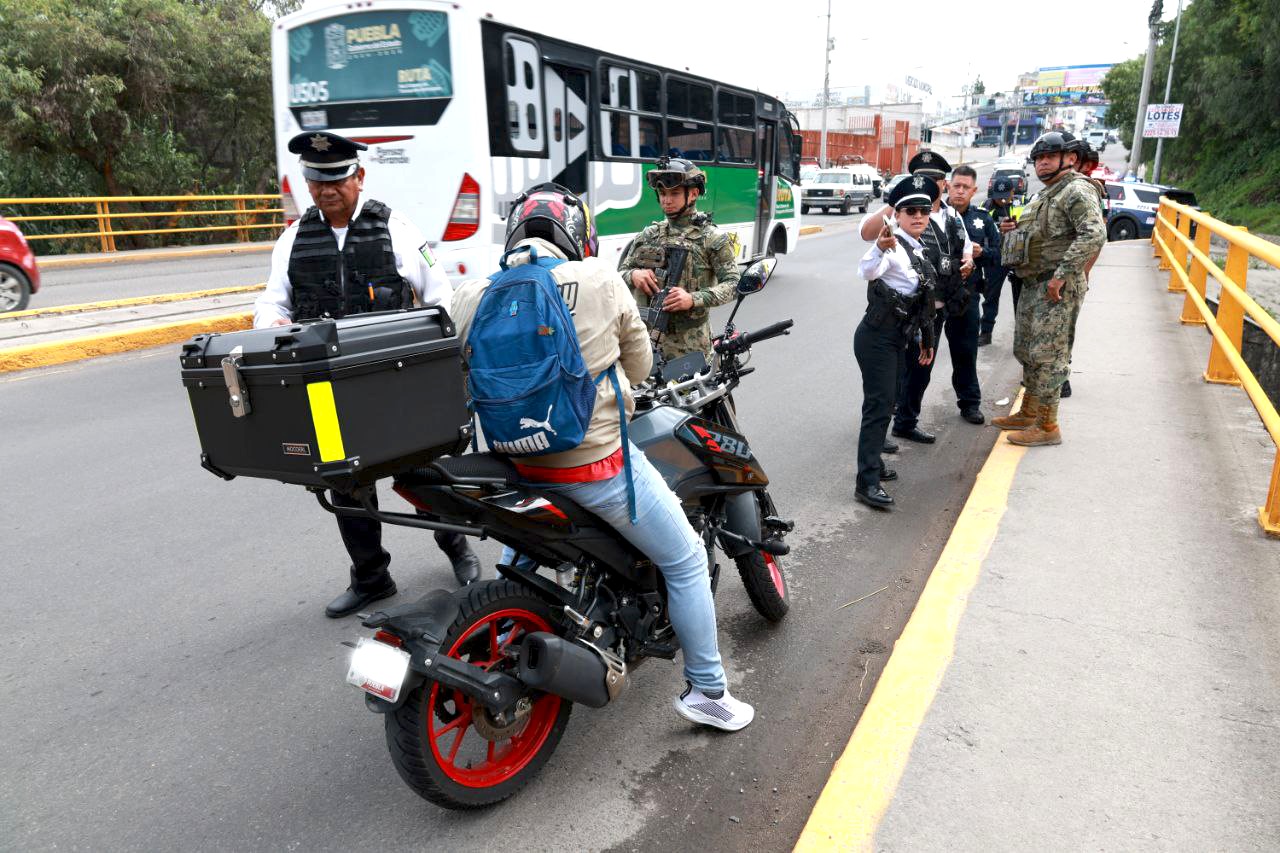 CIUDAD DE PUEBLA, Pue.- Con el objetivo de inhibir la comisión de delitos a bordo de motocicletas y garantizar el cumplimiento de la normativa vial, la Secretaría de Seguridad Pública (SSP), en coordinación con autoridades federales y municipales, implementó el “Operativo ROMA” sobre el Bulevar Carlos Camacho Espíritu, a la altura de San Francisco Totimehuacan.