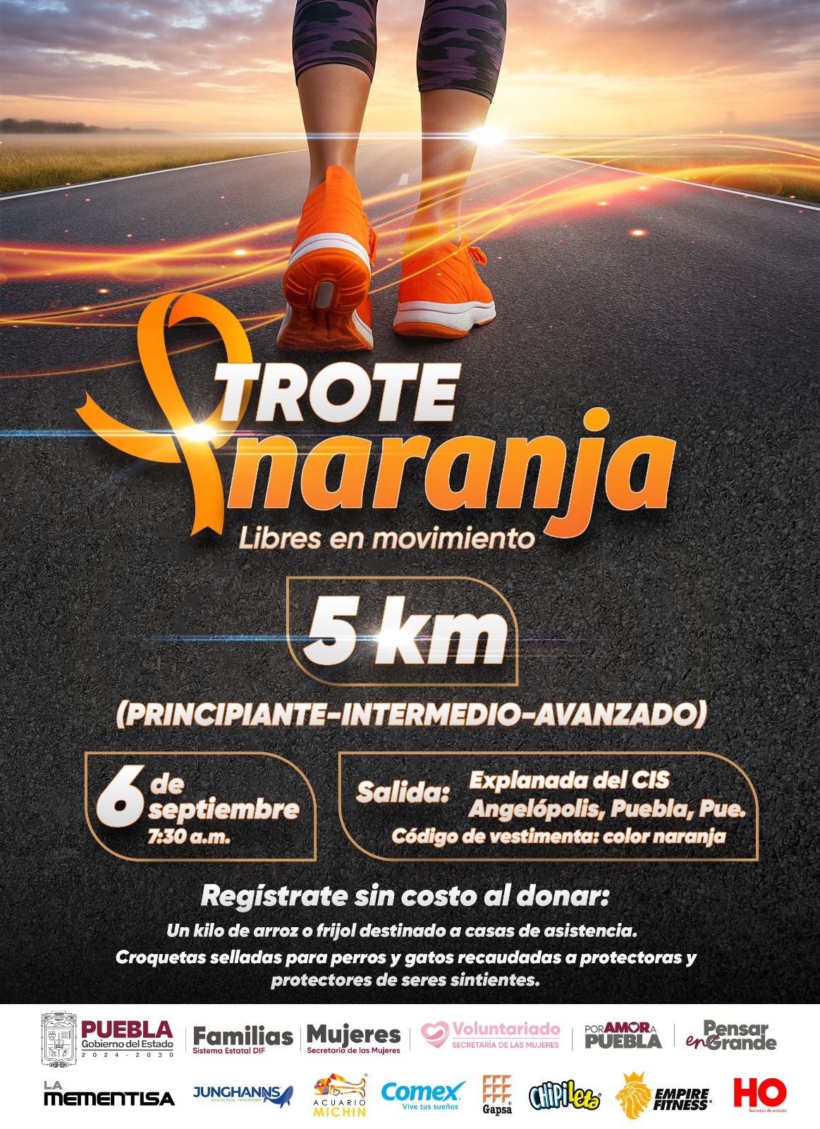 CIUDAD DE PUEBLA, Pue.- Con el objetivo de fortalecer los vínculos solidarios y promover la construcción de entornos seguros, el Gobierno del Estado de Puebla, a través de la Secretaría de las Mujeres y su Voluntariado, convoca a la ciudadanía a participar en la carrera “Trote Naranja: Libres en Movimiento”, que se llevará a cabo el próximo sábado 6 de septiembre de 2025, a partir de las 7:30 horas, con punto de salida en la Explanada del Centro Integral de Servicios (CIS) Angelópolis.