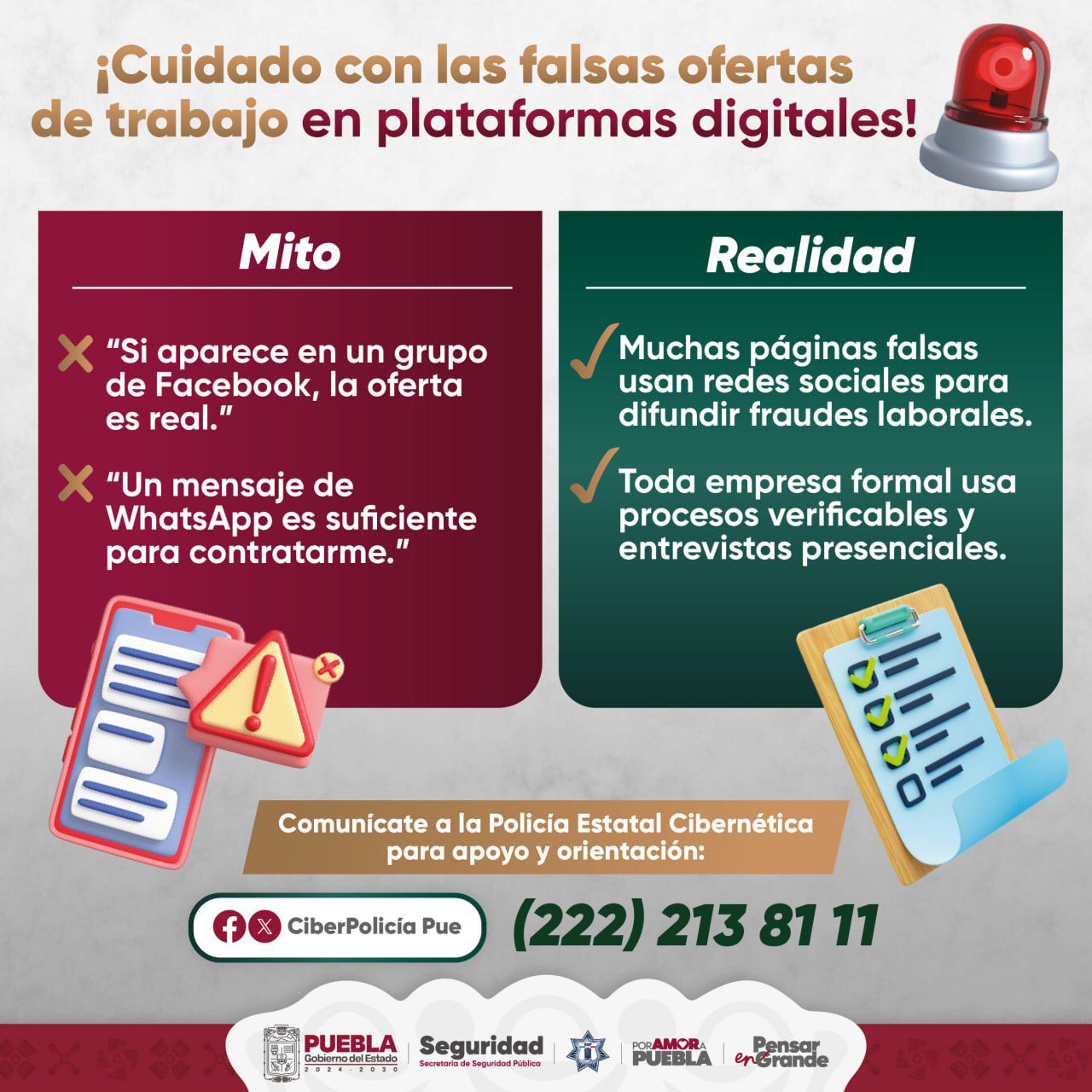 CIUDAD DE PUEBLA, Pue. – El Gobierno del Estado de Puebla, a través de la Secretaría de Seguridad Pública (SSP), emite recomendaciones ante ofertas de trabajo falsas en plataformas digitales, y exhorta a la población a redoblar medidas de autocuidado para inhibir la comisión de delitos.