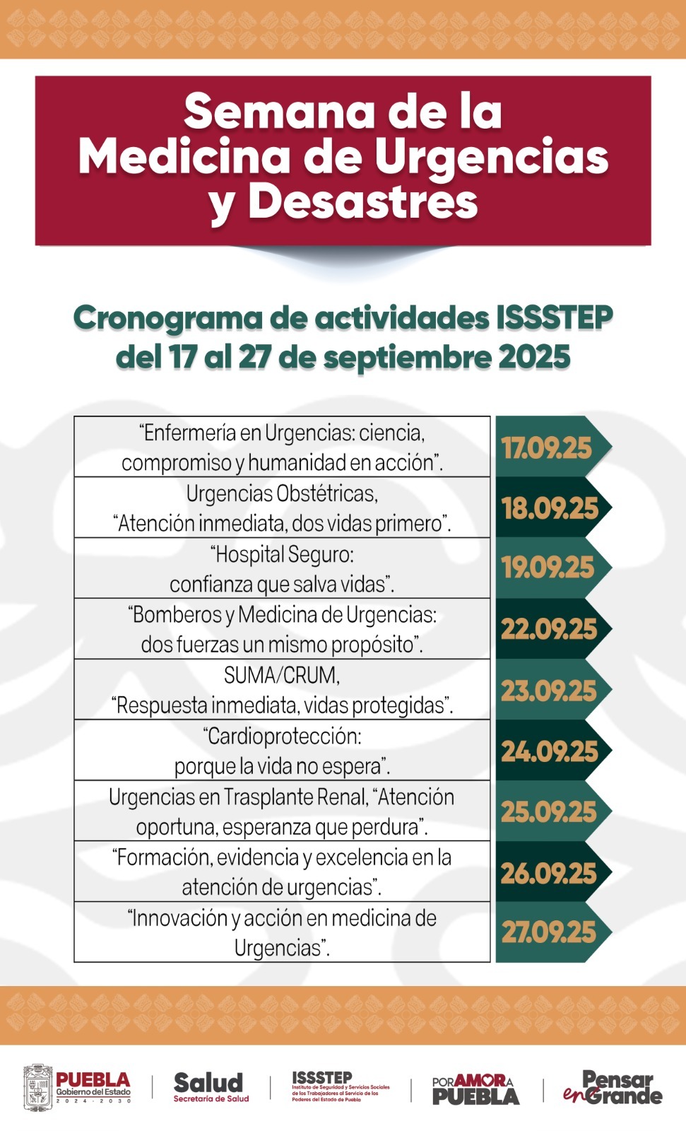 Por Amor a Puebla y bajo el enfoque de la bioética social que se impulsa desde el Gobierno del Estado de Puebla, encabezado por el mandatario Alejandro Armenta, el ISSSTEP reafirma su compromiso mediante estrategias que concienticen a la población sobre la Medicina de Urgencias y atención a desastre, para así contribuir a salvaguardar lo más importante: la vida.