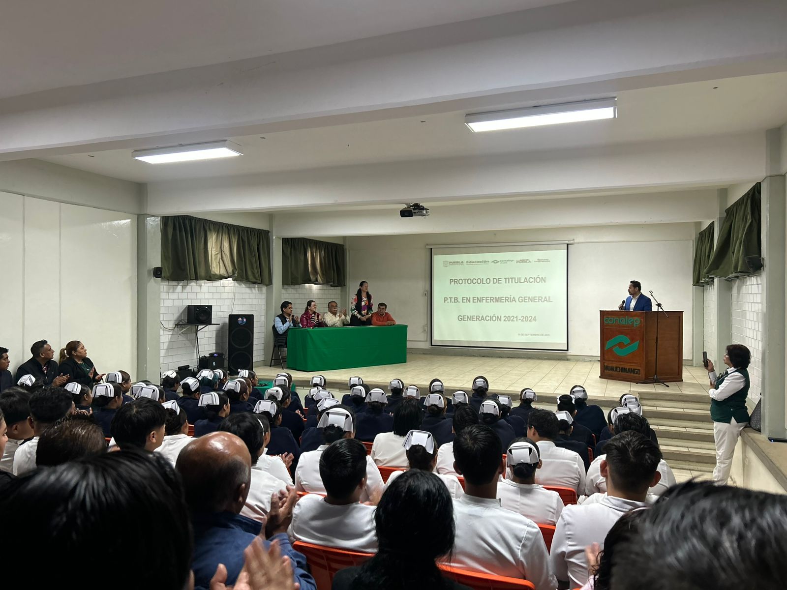 HUAUCHINANGO, Pue.- Con el propósito de ofrecer confianza académica y profesional al alumnado para su bienestar, el Colegio de Educación Profesional Técnica del Estado de Puebla (Conalep), llevó a cabo la Ceremonia de Protocolo para la Titulación de 70 pasantes de la carrera de Enfermería General de la generación 2021-2024 del plantel de este municipio.