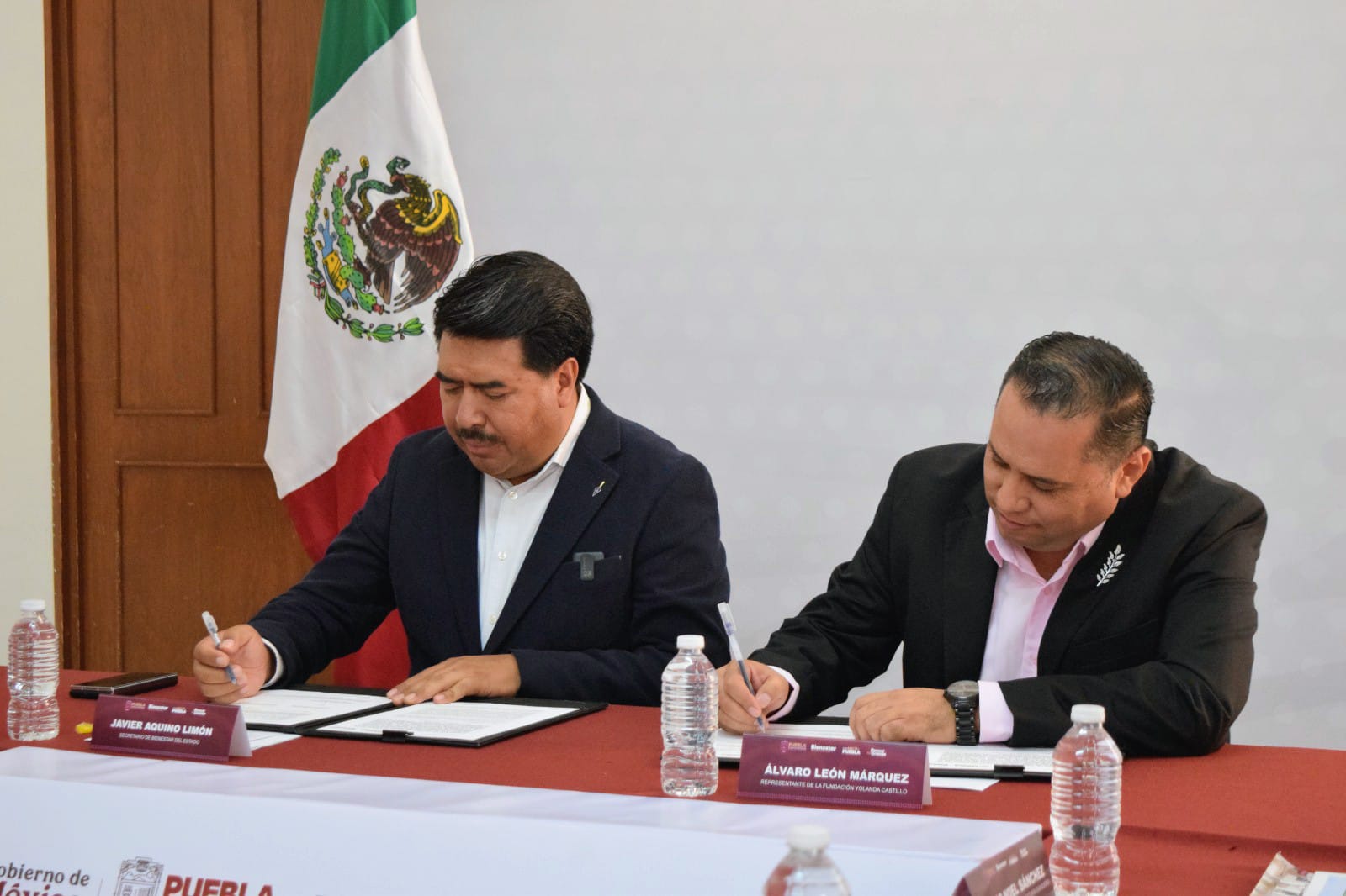 CIUDAD DE PUEBLA, Pue.- El secretario de Bienestar, Javier Aquino Limón, y el representante de la Fundación Yolanda Castillo, Álvaro León Márquez, firmaron un convenio de colaboración cuyo objetivo es mejorar las condiciones productivas y sociales de comunidades en situación de vulnerabilidad.
