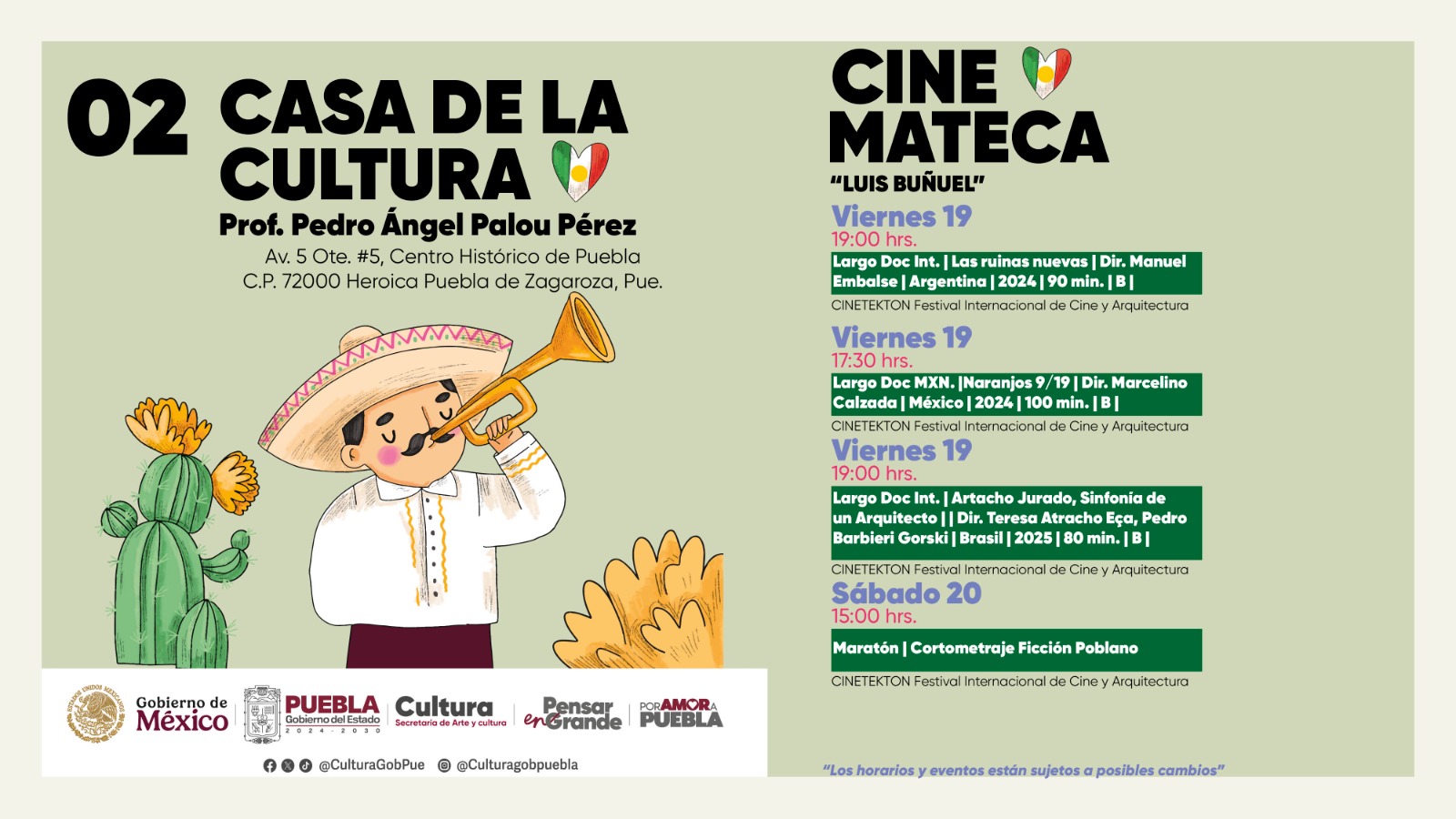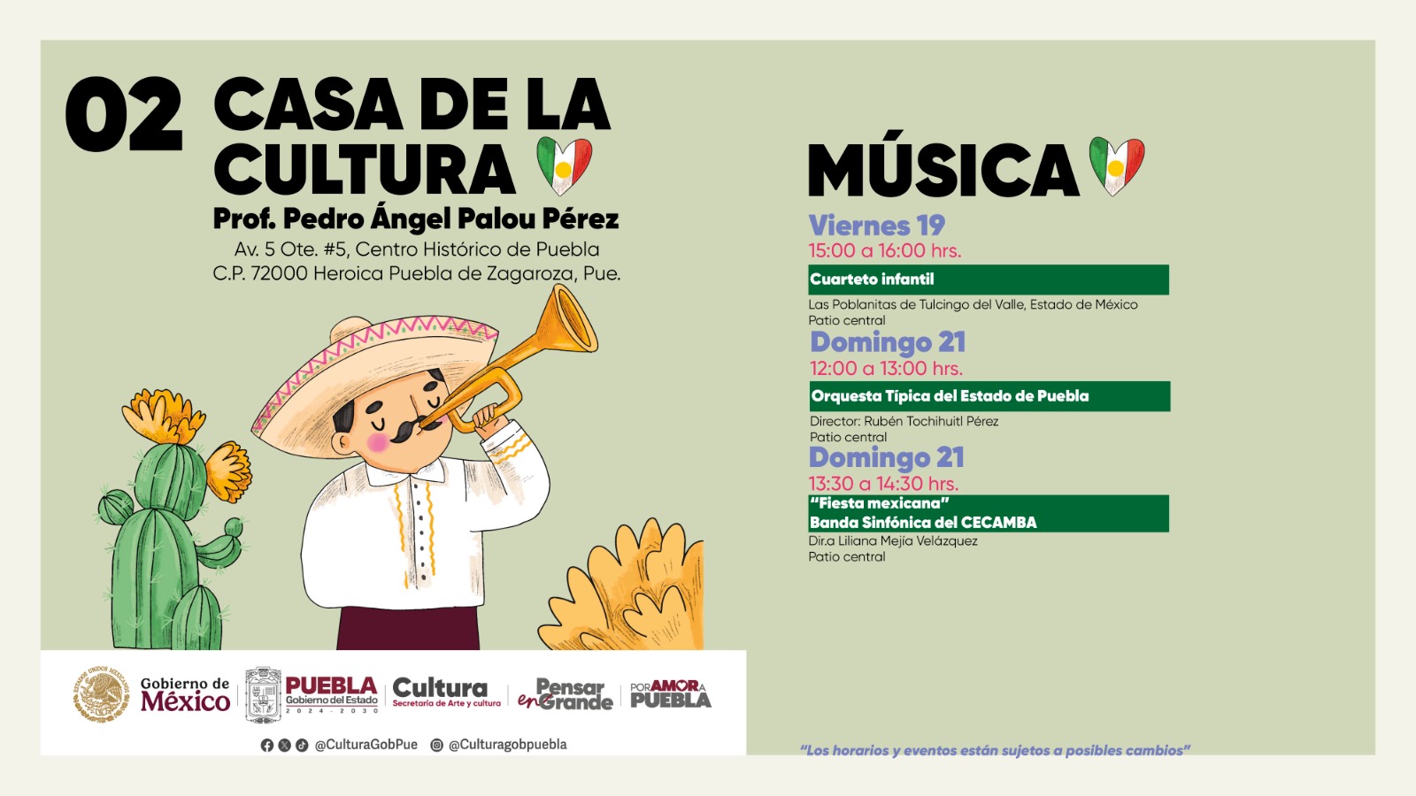 - La Orquesta Sinfónica del Estado de Puebla presentará una Noche de Boleros en el Auditorio de la Reforma, mientras que la Banda Sinfónica del CECAMBA desarrollará el repertorio “Fiesta Mexicana” en la Casa de la Cultura.