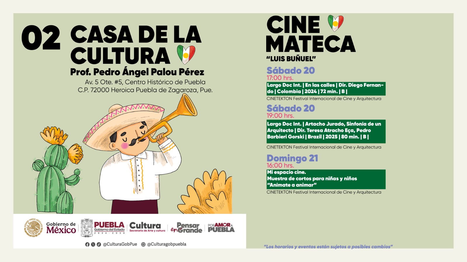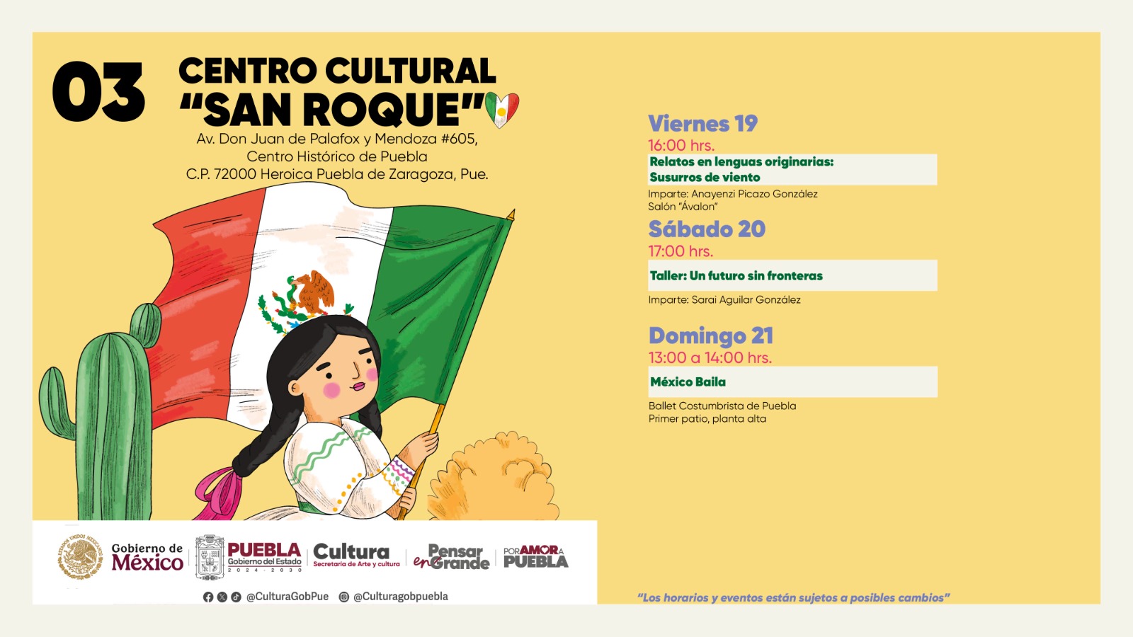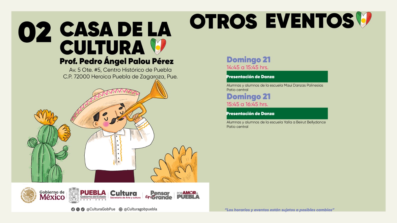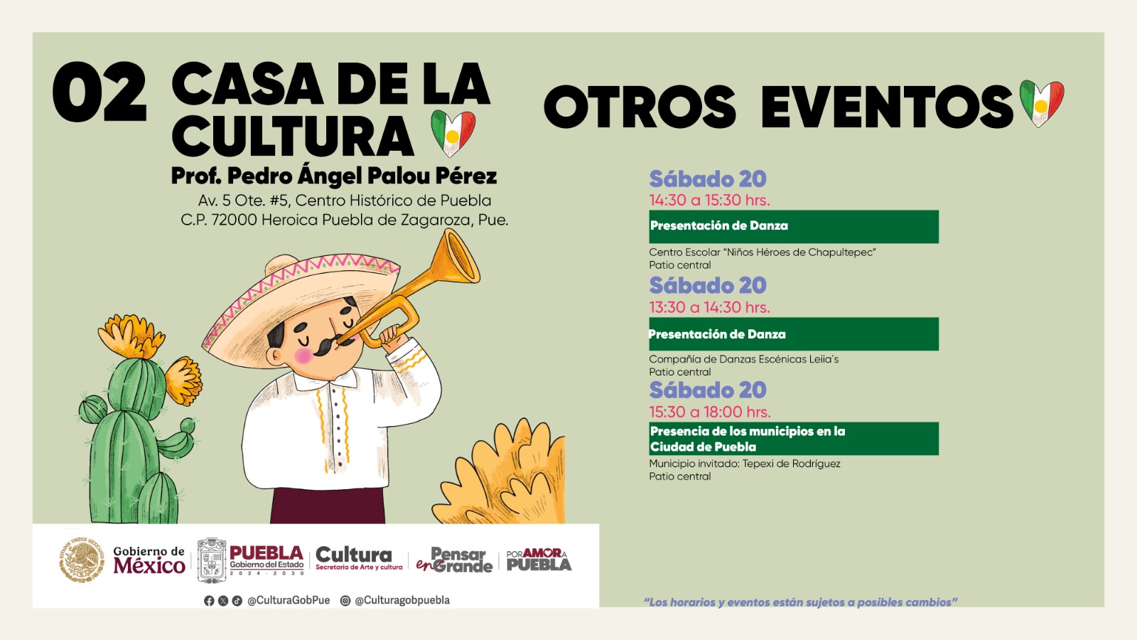 Además, el Ballet Costumbrista de Puebla presentará “México Baila”, en la planta alta del primer patio del Centro Cultural “San Roque”, igualmente el día 21 a las 13:00 horas. Todas estas actividades son gratuitas, para consultar detalles, las y los interesados pueden ingresar a las redes sociales de la Secretaría de Arte y Cultura: Facebook “Secretaría de Cultura Puebla”, X “@CulturaGobPue” e Instagram: “@CulturaGobPue”.