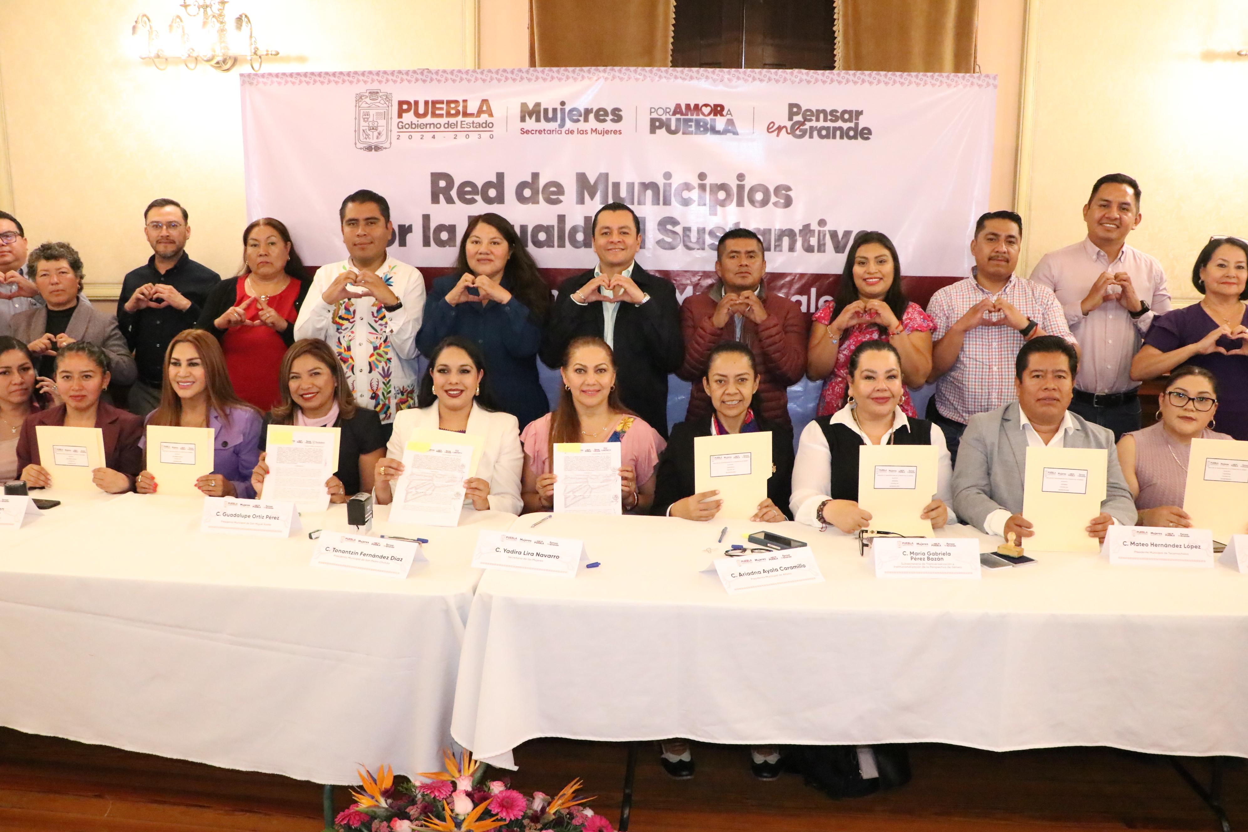 CIUDAD DE PUEBLA, Pue.- Con el objetivo de fortalecer las capacidades institucionales de los ayuntamientos y así garantizar a las mujeres el derecho a una vida libre de violencias, el Gobierno del Estado, a través de la Secretaría de las Mujeres, llevó a cabo la firma del convenio de colaboración para integrar la “Red de Municipios por la Igualdad Sustantiva”.