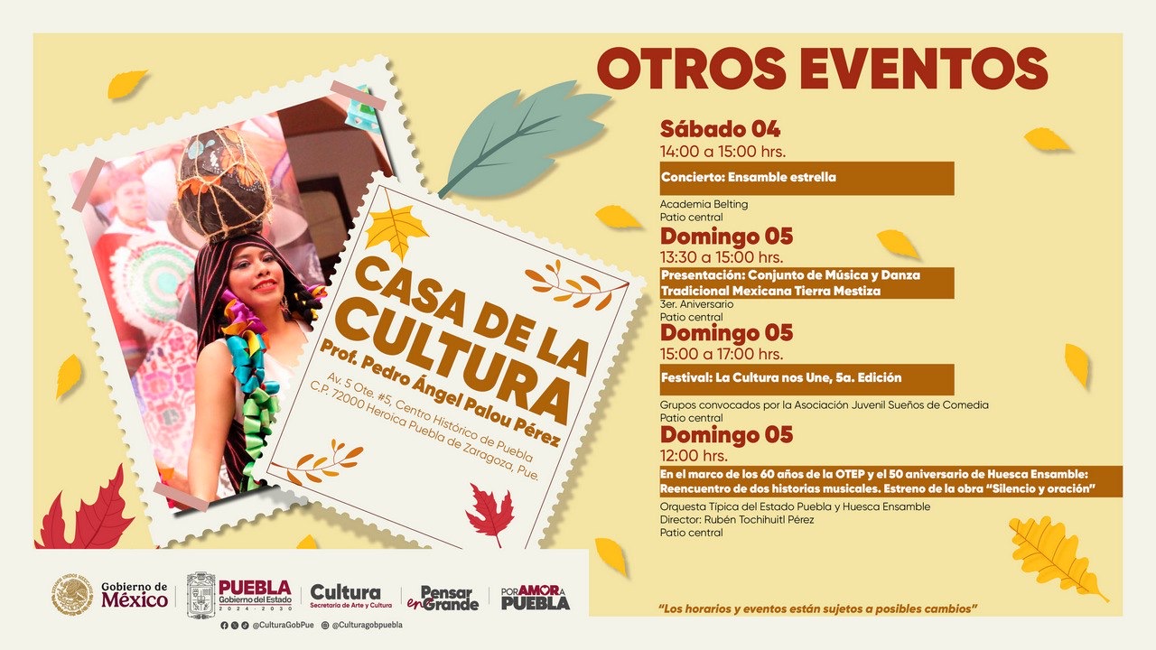 Además, el domingo 05 de octubre, a las 13:30 horas, en el patio central de dicho lugar se celebrará el 3er. Aniversario del Conjunto de Música y Danza Tradicional Mexicana Tierra Mestiza, una agrupación que ha llevado el folclore mexicano a diversos escenarios con presentaciones que fusionan sones, zapateados y piezas musicales emblemáticas. En tanto, a las 15:00 horas, la programación se enriquecerá con la quinta edición del Festival “La Cultura nos Une”. Estas actividades ofrecerán a las y los asistentes una oportunidad para rendir homenaje al patrimonio inmaterial y al talento poblano.