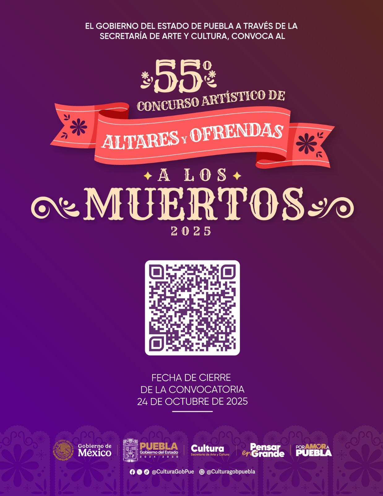 CIUDAD DE PUEBLA, Pue.- El Gobierno del Estado de Puebla, encabezado por Alejandro Armenta, organiza la 55ª edición del tradicional Concurso Artístico de Altares y Ofrendas a los Muertos, con el propósito de preservar y promover las expresiones culturales identitarias del país, así como reconocer el talento y la creatividad de la entidad. Al respecto, la Casa de la Cultura “Profesor Pedro Ángel Palou Pérez” abrió el periodo de inscripciones para dicho certamen, que se realizará del 28 de octubre al 2 de noviembre en sus instalaciones.