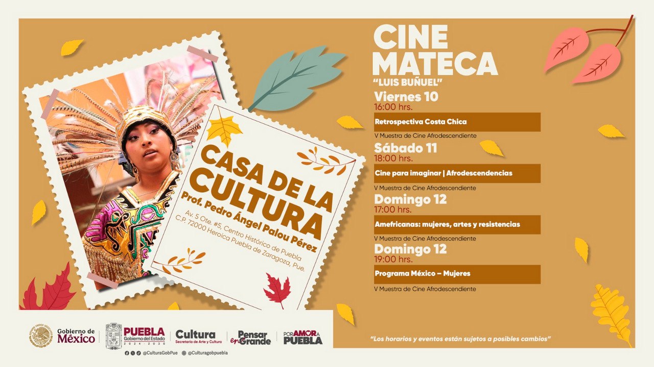 A esta programación se suma la presentación “México de Colores”, a cargo de la Compañía Merki Teatro y el Ballet Folklórico Tlatoani, a las 15:00 horas; así como dos funciones de la V Muestra de Cine Afrodescendiente, que se realizarán dentro de la Cinemateca “Luis Buñuel” a las 17:00 y 19:00 horas, respectivamente. Todos los eventos desarrollados por la Secretaría de Arte y Cultura están disponibles en la página sayc.puebla.gob.mx.
