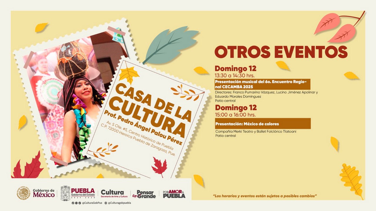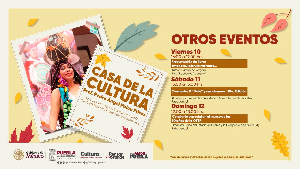 Este evento tendrá lugar en la Casa de la Cultura “Profesor Pedro Ángel Palou Pérez”, ubicada en la 5 Oriente no. 5 del Centro Histórico, el próximo domingo 12 de octubre, a partir de las 13:30 horas, con entrada gratuita. Participarán estudiantes provenientes de Chalchicomula de Sesma, Cuetzalan del Progreso, Huitziltepec y Puebla Capital.