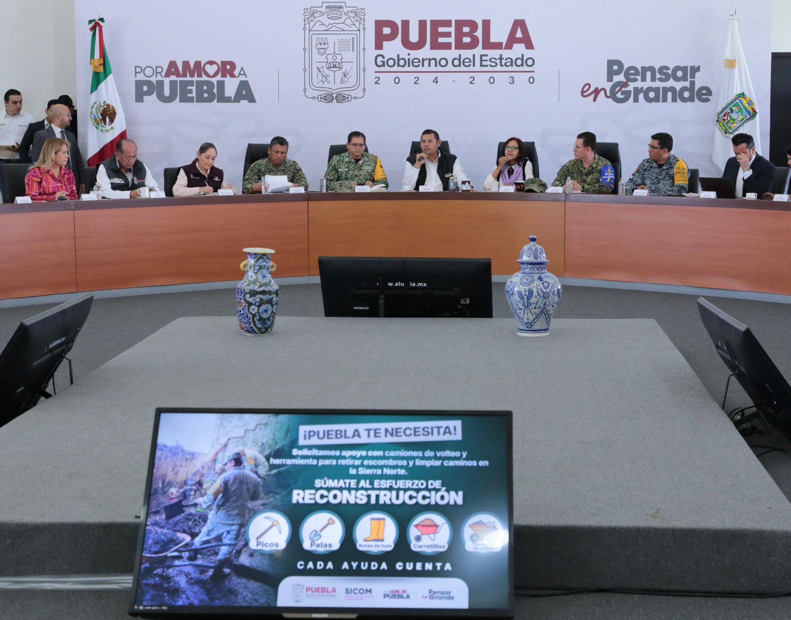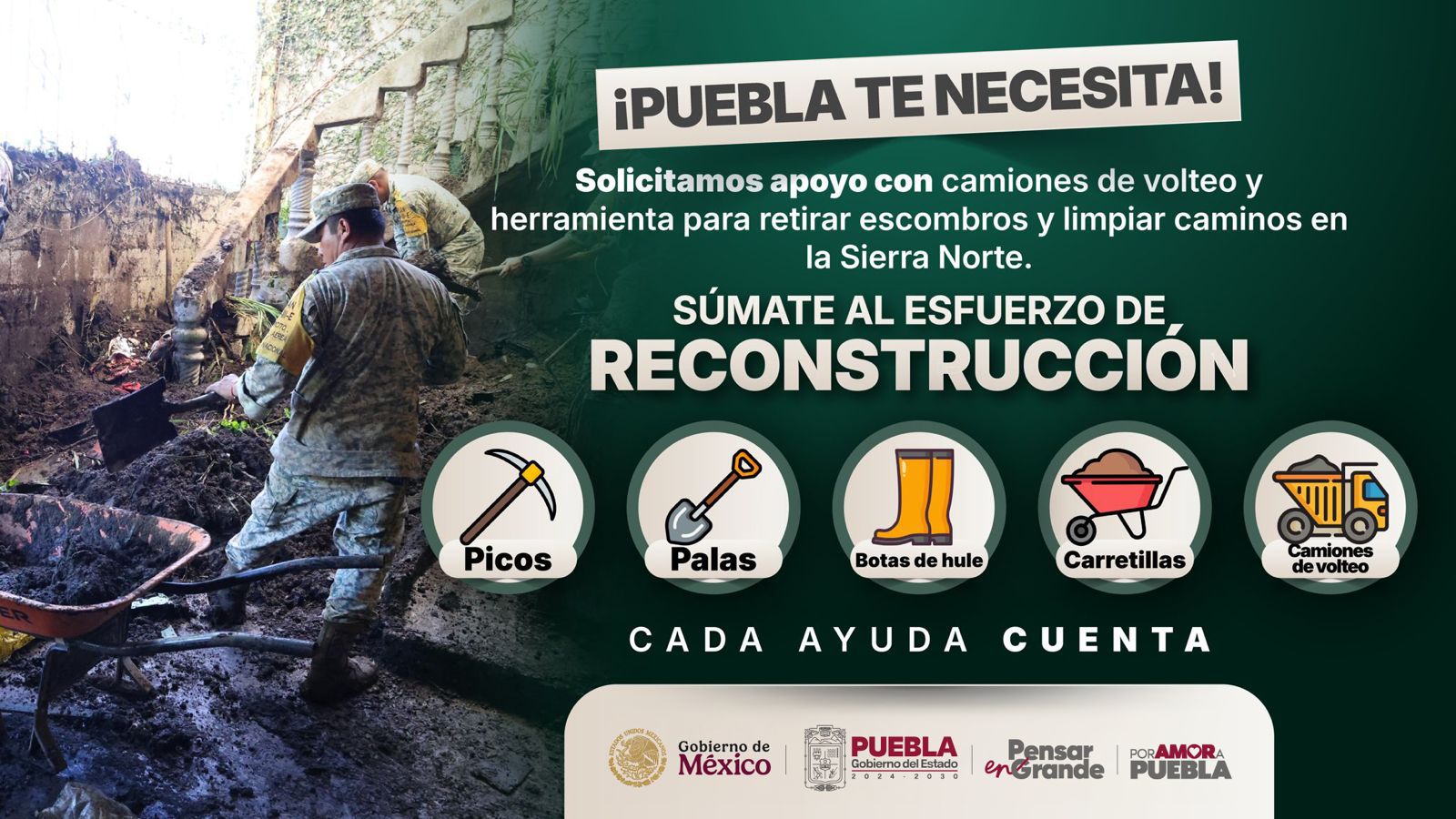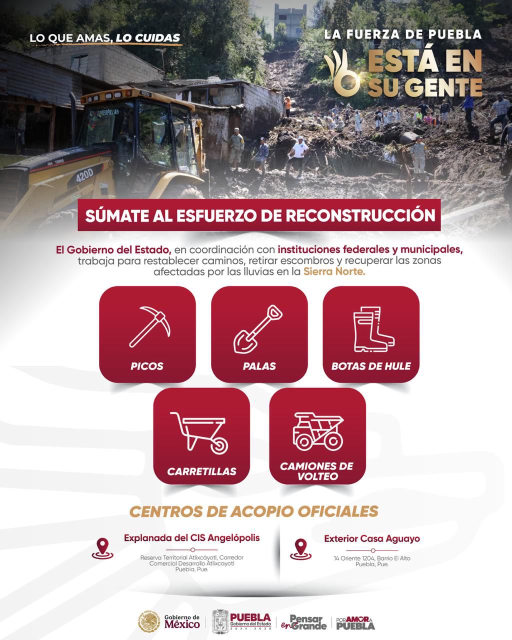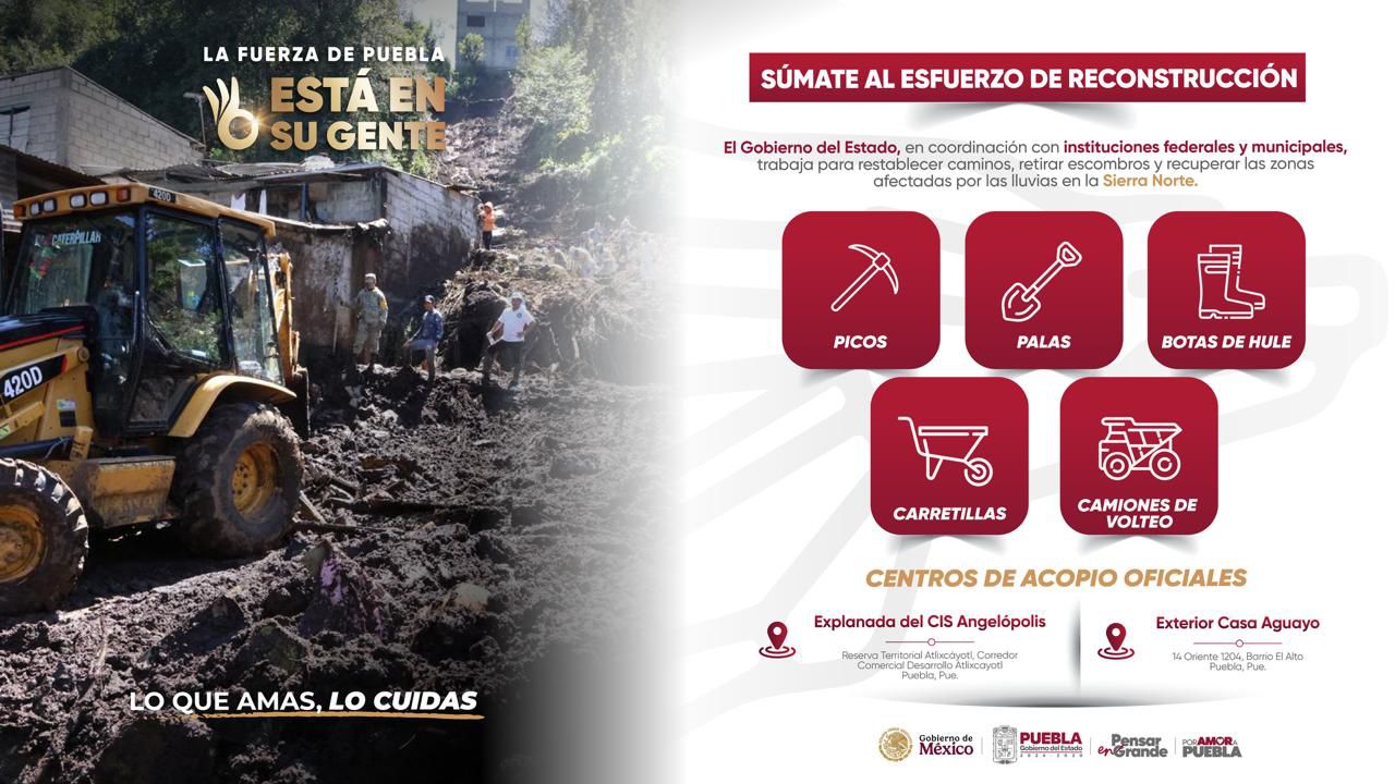 El gobernador Alejandro Armenta, reiteró que los apoyos que se requieren por parte de la iniciativa privada son picos, palas, botas de hule, carretillas y camiones de volteo que sirvan para el retiro de escombros y saneamiento de caminos en las comunidades de la Sierra Norte. En el caso de las y los poblanos se pide su apoyo con alimentos enlatados, artículos de limpieza como cubetas, escobas y cloro; además para la higiene personal y alimento para seres sintientes.
