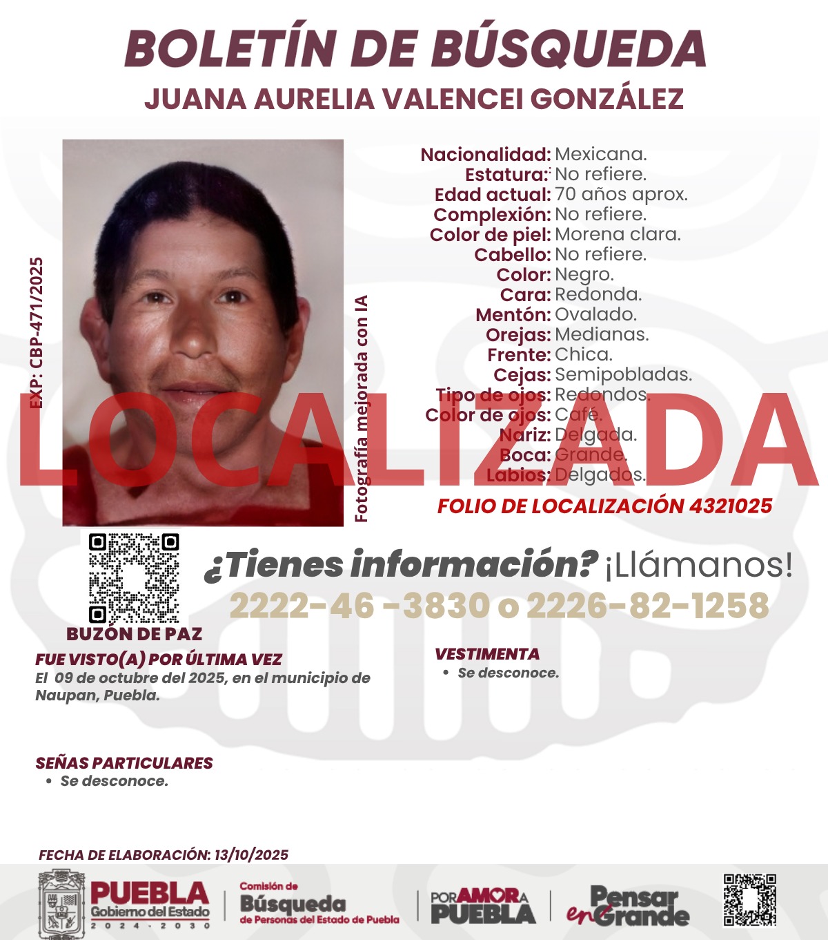 - Juana Aurelia Valencei González, de 70 años, originaria del municipio de Naupan.