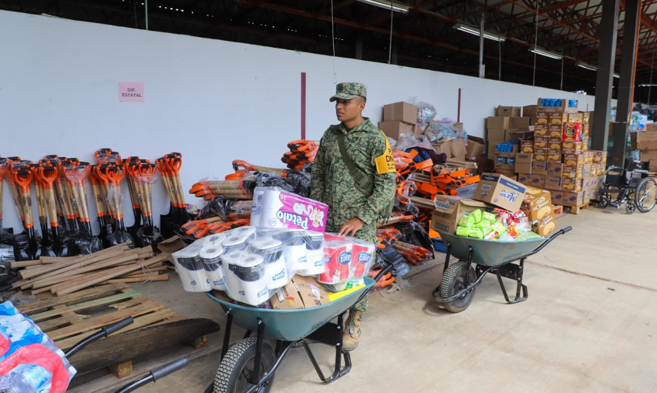 Por su parte, el director del DIF, Juan Carlos Valdez Saya, señaló que continúa el acopio de provisiones y llamó a la población a seguir con la donación de víveres, los cuales son entregados oportunamente en conjunto con los elementos de la Secretaría de la Defensa Nacional, Marina y Guardia Nacional. Informó que al corte del 16 de octubre, el Sistema Estatal DIF ha distribuido más de 44 mil apoyos en 16 municipios, entre ellos catres, cobertores, colchonetas, despensas, kits de higiene y limpieza; así como herramientas como carretillas, picos y palas.