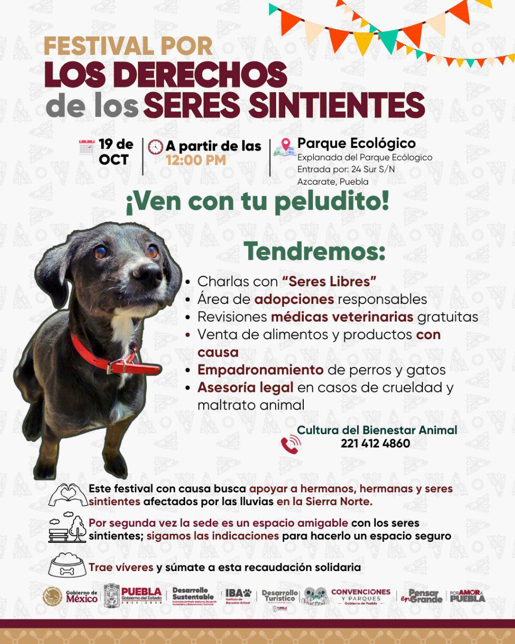 CIUDAD DE PUEBLA, Pue.- En un esfuerzo conjunto entre el Gobierno del Estado de Puebla, encabezado por el gobernador Alejandro Armenta, y la sociedad civil organizada, el Instituto de Bienestar Animal llevará a cabo el primer Festival por los Derechos de los Seres Sintientes. Este encuentro con causa busca fomentar el respeto, la empatía y la atención hacia todos los seres que cohabitan el entorno.
