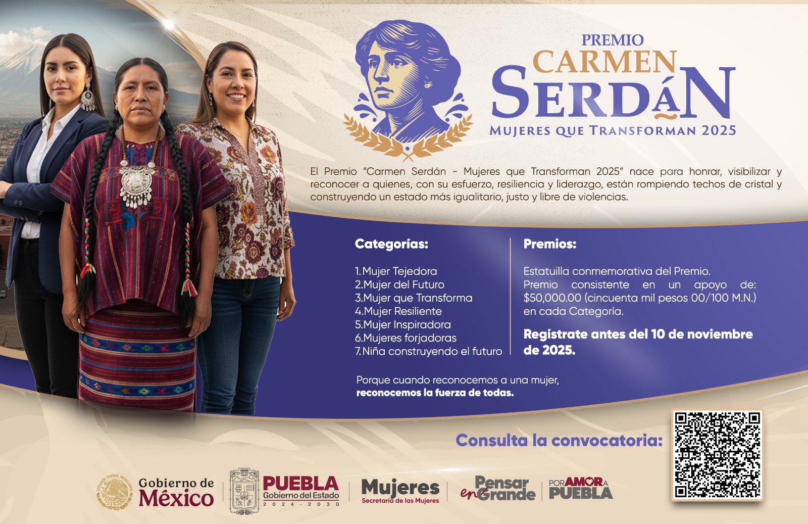 CIUDAD DE PUEBLA, Pue.- Con el propósito de honrar, visibilizar y reconocer a mujeres que, con su esfuerzo, resiliencia y liderazgo, contribuyen a la construcción de un estado más igualitario, justo y libre de violencias, el Gobierno del Estado de Puebla, a través de la Secretaría de las Mujeres, convoca a participar en el Premio “Carmen Serdán, Mujeres que Transforman 2025”.