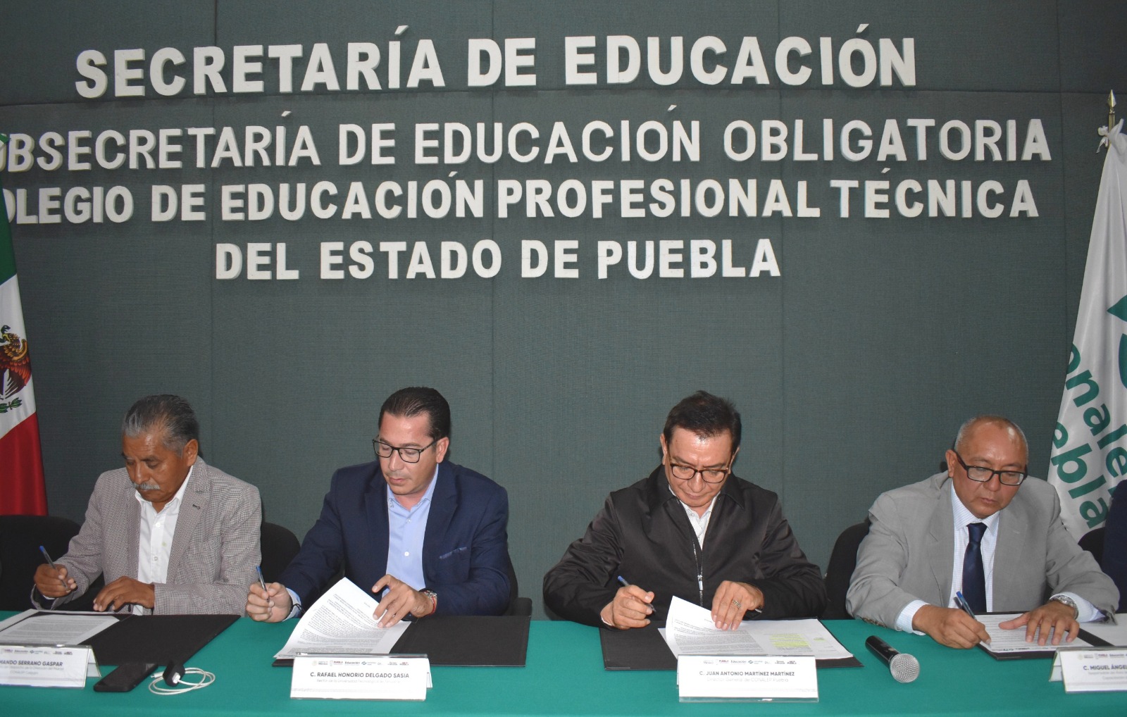 CIUDAD DE PUEBLA, Pue.- A fin de estrechar lazos de cooperación para reforzar la formación integral de la comunidad educativa e impulsar el bienestar en la región, el Colegio de Educación Profesional Técnica del Estado de Puebla (Conalep) y la Universidad Tecnológica de Tehuacán (UTT), firmaron un convenio mediante el cual estudiantes tendrán acceso a servicio social, prácticas profesionales, sistema de educación dual, talleres, capacitación, donaciones, bolsa de trabajo y apoyos económicos.
