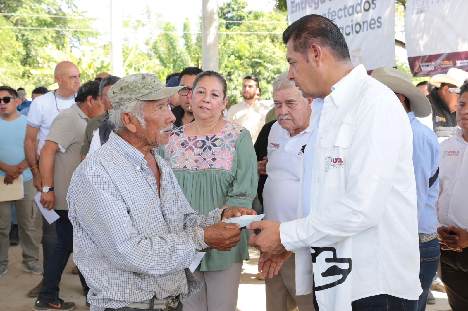 FRANCISCO Z. MENA, Pue.– Como parte de las acciones de respuesta inmediata ante las afectaciones ocasionadas por las lluvias en la Sierra Norte, el gobernador Alejandro Armenta encabezó la primera entrega de apoyos por indemnizaciones agropecuarias en beneficio de productoras y productores de las localidades de La Ceiba y La Máquina.