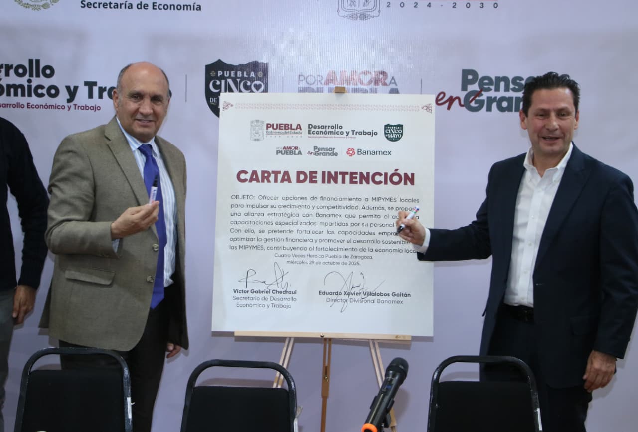 CIUDAD DE PUEBLA, Pue.- El gobierno que encabeza el mandatario Alejandro Armenta suscribió una carta de intención con Banamex para fortalecer el acceso al financiamiento de las micro, pequeñas y medianas empresas poblanas con la tasa de financiamiento más baja del país. Este convenio consolida la estrategia económica estatal orientada al crecimiento con justicia social y desarrollo sostenible, al ofrecer a las y los empresarios locales la tasa de financiamiento más baja del país, con el propósito de impulsar su competitividad y productividad.