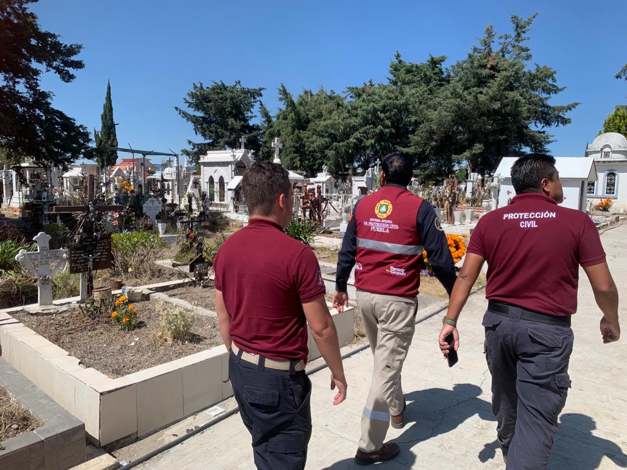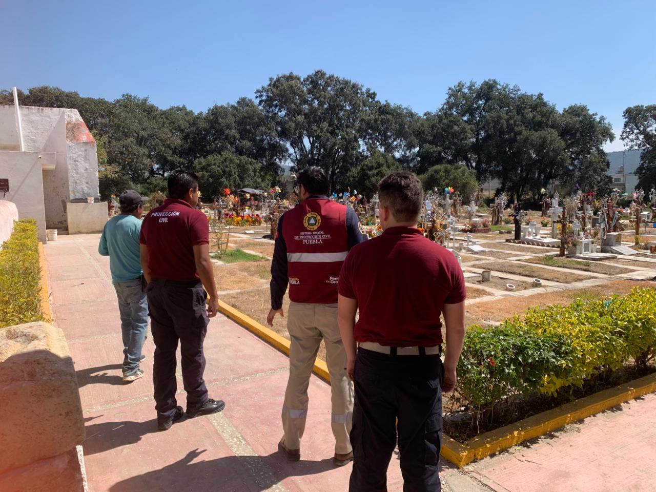 CIUDAD DE PUEBLA, Pue.- Con motivo de las actividades de Día de Muertos, el personal de la Coordinación General de Protección Civil y Gestión del Riesgo de Desastres refuerza las labores de supervisión en panteones de la entidad.