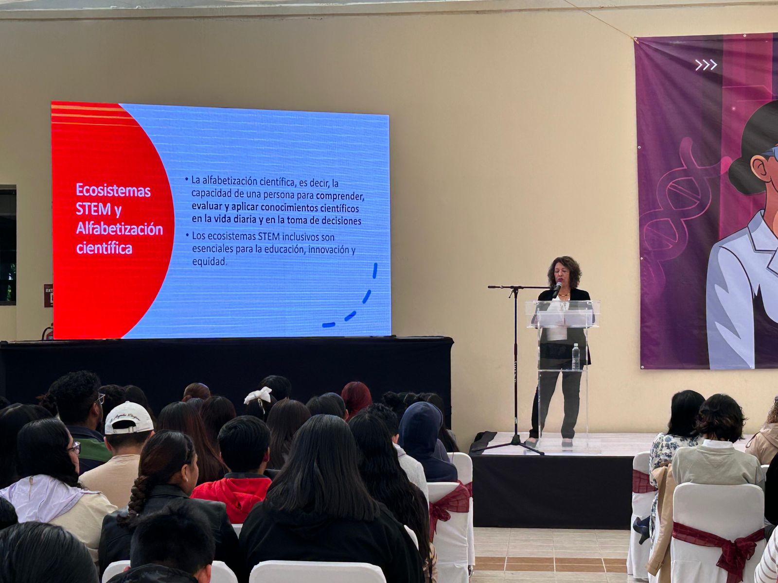 Durante su ponencia “Mujeres docentes como motor de la Alfabetización Científica”, en la Universidad Tecnológica de Huejotzingo (UTH), la funcionaria subrayó que las mujeres son agentes estratégicos para democratizar el conocimiento científico. Navarro Rangel recalcó la importancia de formar a personal docente con una visión especializada que integre la perspectiva de género en la enseñanza de la ciencia.