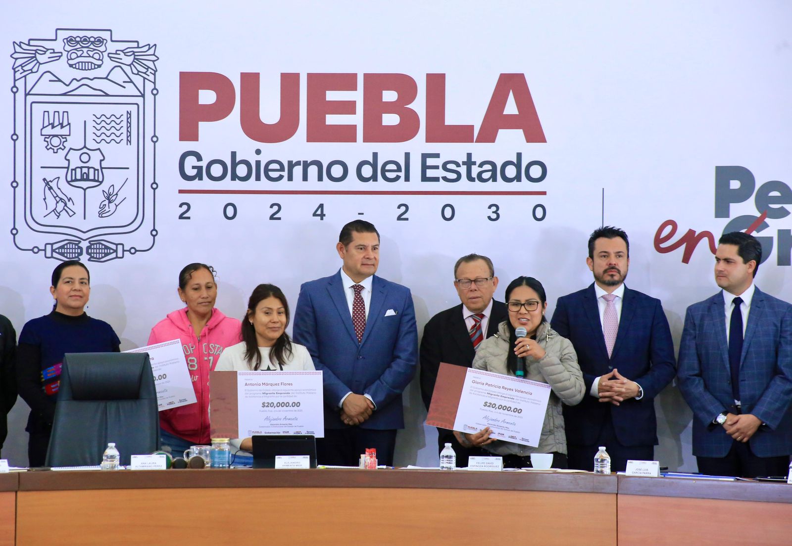 CIUDAD DE PUEBLA, Pue.- Con el compromiso de apoyar a las y los poblanos que regresan a la entidad, fomentar el desarrollo económico y el Amor a Puebla, el gobernador Alejandro Armenta durante la mañanera, encabezó la entrega de apoyos del Programa "Migrante Emprende", a fin de generar autoempleo mediante un proyecto productivo o la instalación de un pequeño negocio que les permita tener un ingreso para el bienestar y desarrollo propio.