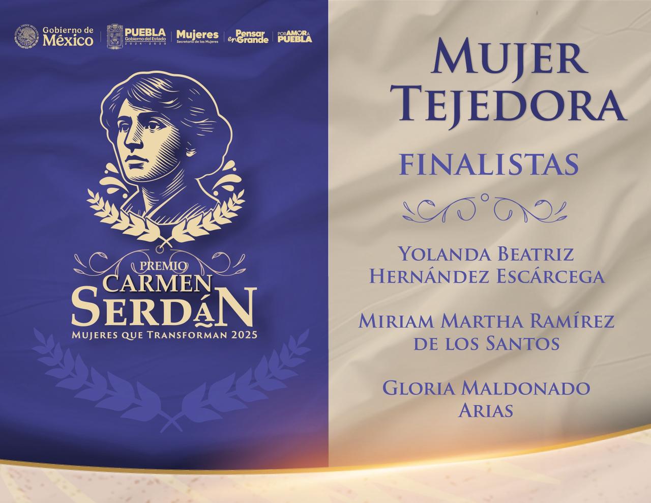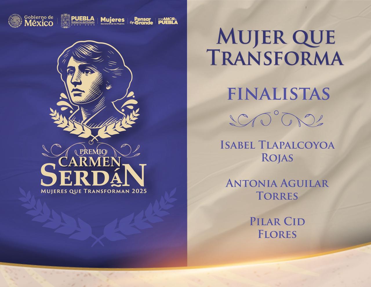 CIUDAD DE PUEBLA, Pue.- El Gobierno del Estado de Puebla, a través de la Secretaría de las Mujeres, da a conocer a las finalistas del Premio Carmen Serdán “Mujeres que Transforman” 2025, un reconocimiento que visibiliza la fuerza, el liderazgo y la contribución de mujeres que impulsan el desarrollo social, comunitario y profesional en la entidad.