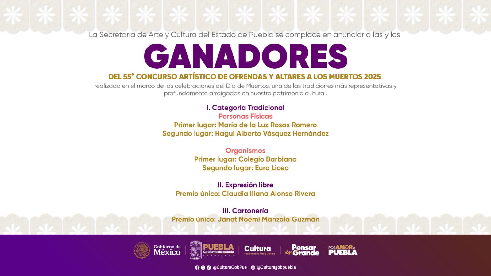 De forma paralela, la Secretaría de Arte y Cultura anuncia a las y los seleccionados del 55° Concurso Artístico de Ofrendas y Altares a los Muertos 2025, realizado como parte de las celebraciones de una de las tradiciones más representativas del patrimonio cultural poblano.