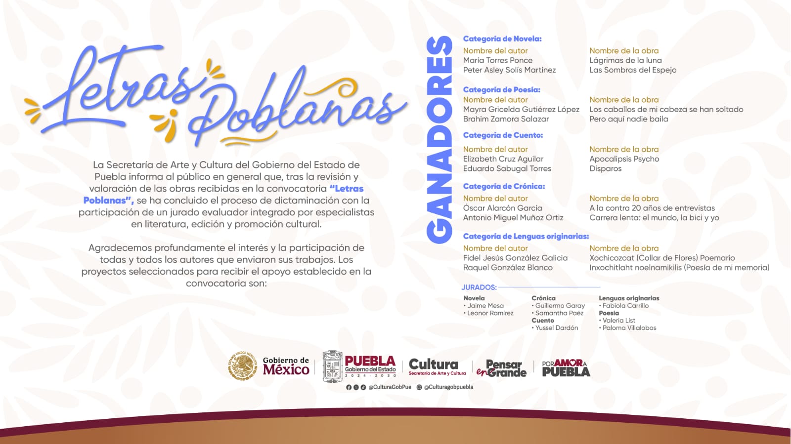 Tras la revisión y valoración de las obras recibidas en Letras Poblanas, un jurado integrado por especialistas en literatura, edición y promoción cultural seleccionó a las y los autores que recibirán el apoyo establecido en la convocatoria. La secretaría agradece la amplia participación que enriqueció este proceso.