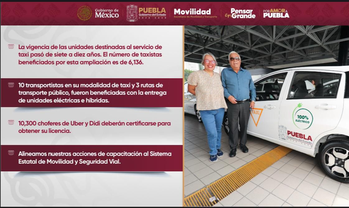 CIUDAD DE PUEBLA, Pue.- El Gobierno de Puebla, encabezado por Alejandro Armenta, anunció acciones decisivas que dejan atrás más de 12 años de abandono en materia de movilidad, por ello presentó un apoyo directo de hasta 20 por ciento para el enganche de unidades híbridas, eléctricas o de bajas emisiones, destinado a concesionarios y permisionarios con vehículos modelo 2015 o anteriores.