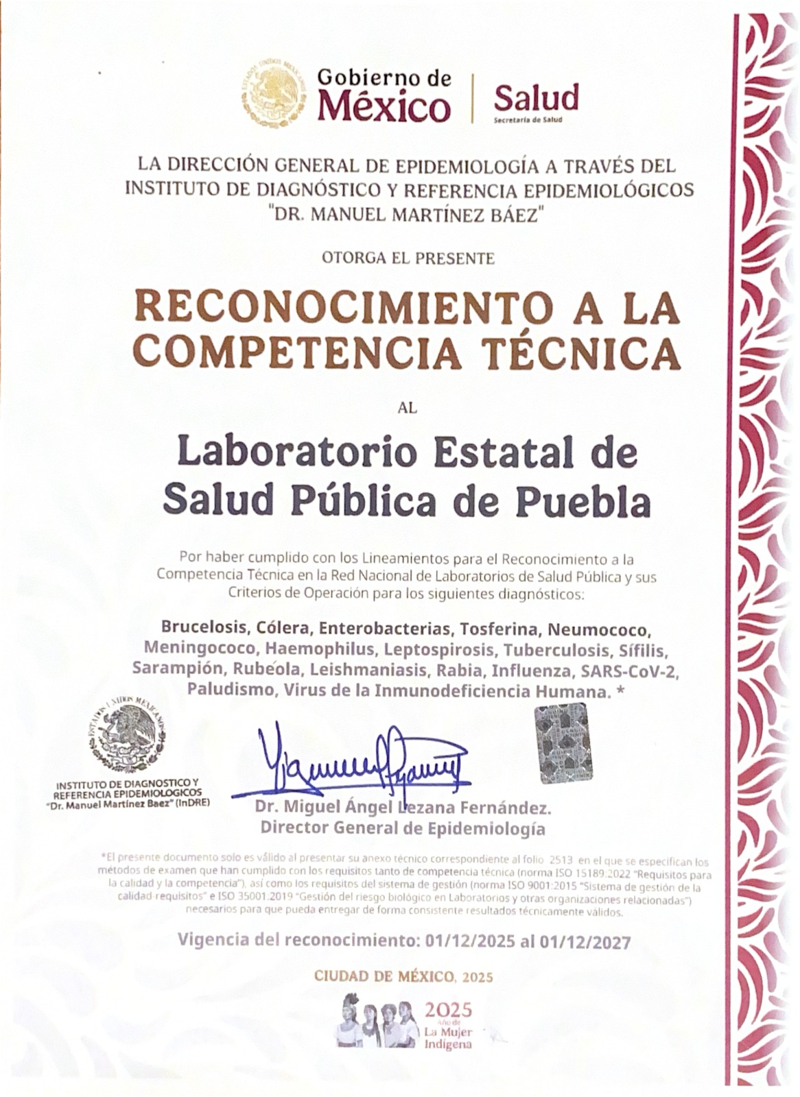 Este reconocimiento confirma que el laboratorio poblano alcanzó un Índice de Desempeño Global de 96.5 por ciento y obtuvo 100 por ciento de cumplimiento, lo que lo acredita como una institución confiable para emitir diagnósticos en 31 pruebas del Marco Analítico Básico.