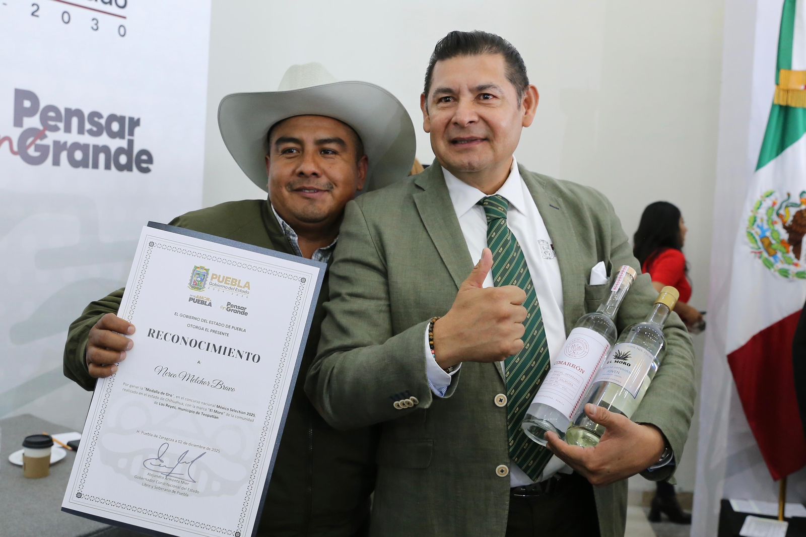 CIUDAD DE PUEBLA, Puebla.- Al entregar reconocimientos a las y los 35 maestros mezcaleros que triunfaron en el Concurso Nacional México Selection 2025, el gobernador Alejandro Armenta subrayó que las y los productores son un orgullo para las y los poblanos, ya que son “mezcaleros de alto rendimiento”, pues son producto del amor al agave.