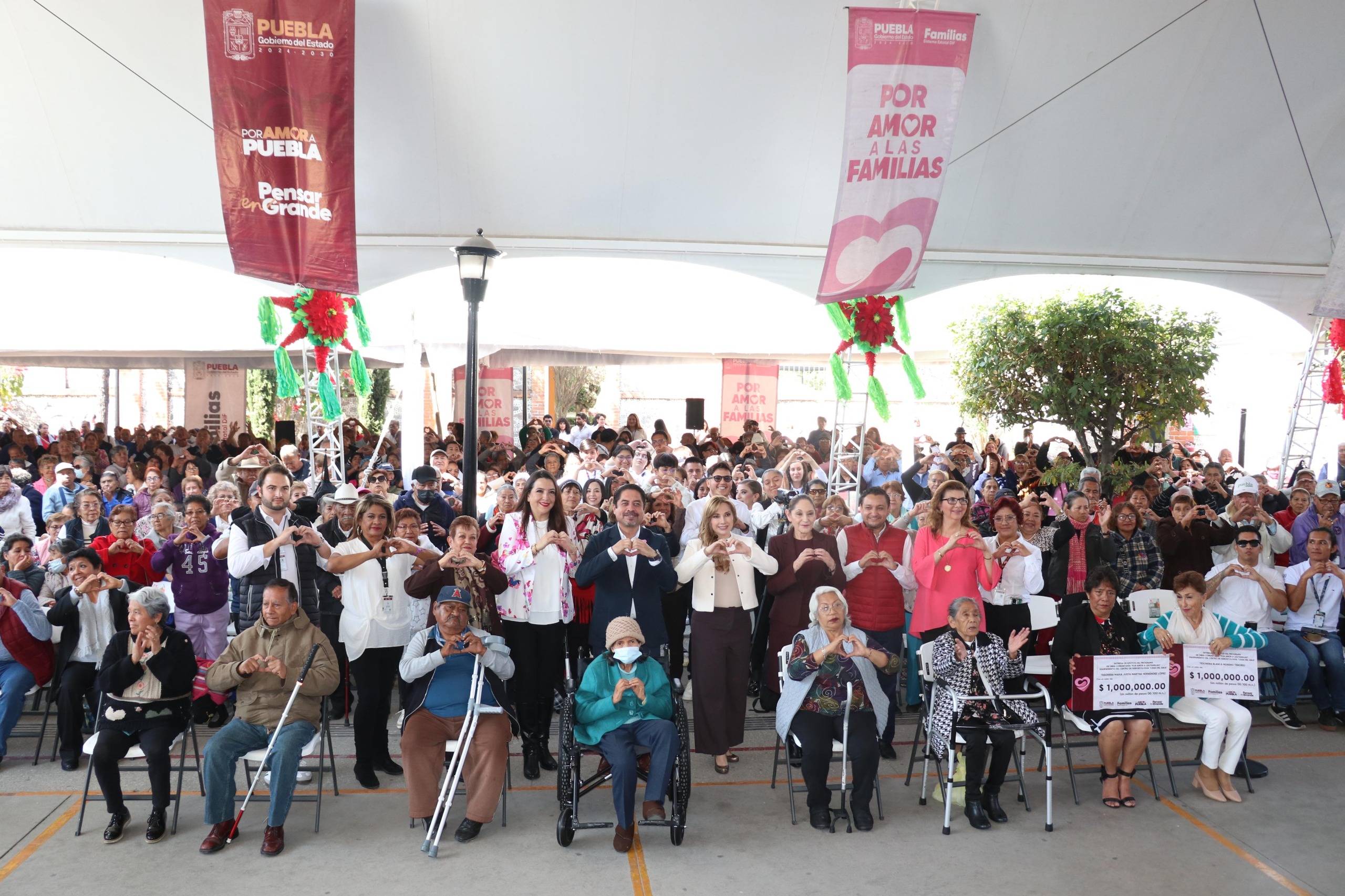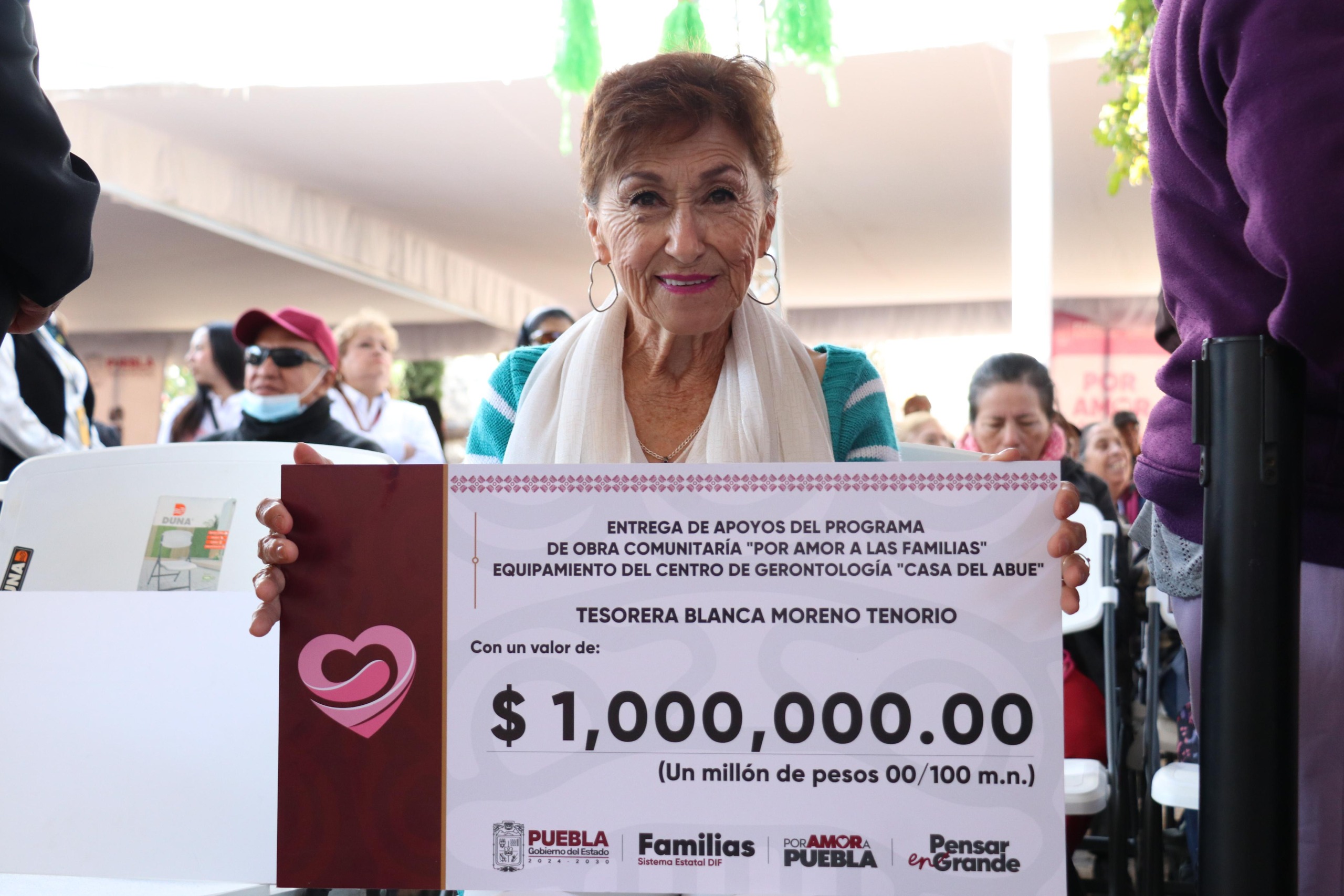 CIUDAD DE PUEBLA, Pue.- Con el objetivo de procurar el cuidado y la comodidad de los adultos mayores que son atendidos en el Centro de Gerontología Casa del Abue, la presidenta del Patronato del Sistema Estatal para el Desarrollo Integral de la Familia (SEDIF), Ceci Arellano, entregó dos cheques de un millón de pesos cada uno, para reequipar los espacios de panadería, taller de cocina, comprar computadoras y mobiliario para las oficinas administrativas, y servicio de podología, así como equipo de audio y de fisiatría.