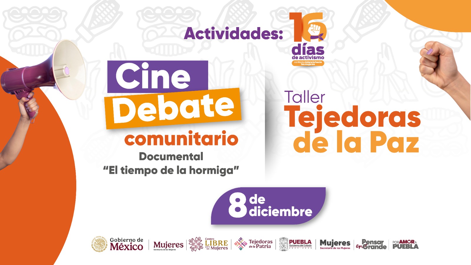 CIUDAD DE PUEBLA, Pue.— Bajo la encomienda de la presidenta Claudia Sheinbaum de construir espacios seguros y de bienestar para las mujeres, el Gobierno del Estado de Puebla que encabeza Alejandro Armenta, a través de la Secretaría de las Mujeres, invita a las poblanas a participar en el Cine Debate Comunitario y en el taller “Tejedoras de Paz”, que se llevarán a cabo en los Centros LIBRE–Casas Carmen Serdán de la entidad.