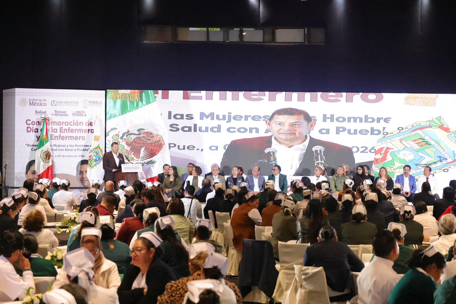 Ante cientos de mujeres y hombres con cofia y bata blanca, el mandatario estatal destacó que este homenaje se inscribe en la visión de la presidenta de México, Claudia Sheinbaum, centrada en la dignidad humana, la justicia social y el reconocimiento al personal de salud como pilar del sistema público. “Amar a Puebla es servirla, como lo hacen las y los enfermeros”, expresó.