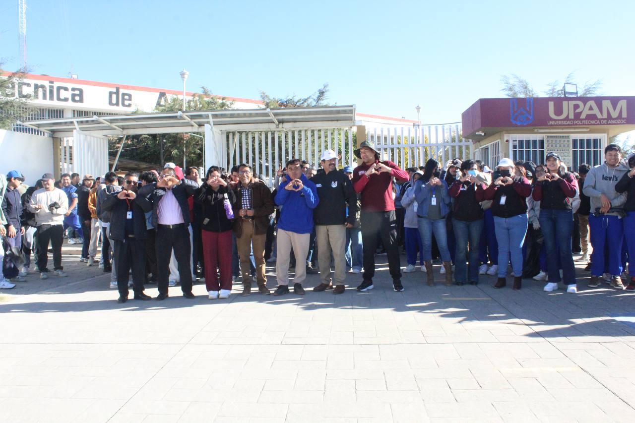 AMOZOC, Pue.– Con el objetivo de fortalecer la participación comunitaria, el sentido de pertenencia y el compromiso social, estudiantes y personal administrativo de la Universidad Politécnica de Amozoc realizaron una faena de limpieza en el acceso principal a esta casa de estudios.