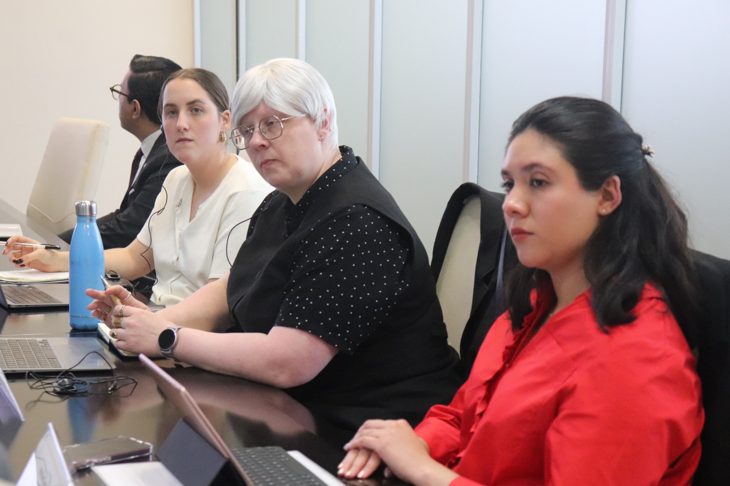 La delegación británica estuvo integrada por la directora adjunta para la Reforma de Compras Públicas de la Oficina del Gabinete del Primer Ministro del Reino Unido, Lindsay Maguire; la jefa de Políticas para la Reforma de Compras Públicas Noa Haga; el oficial de Derechos Humanos y Estado de Derecho de la Embajada Británica en México, Andres Aguas; y la intérprete-traductora, Gabriela Scheiker.