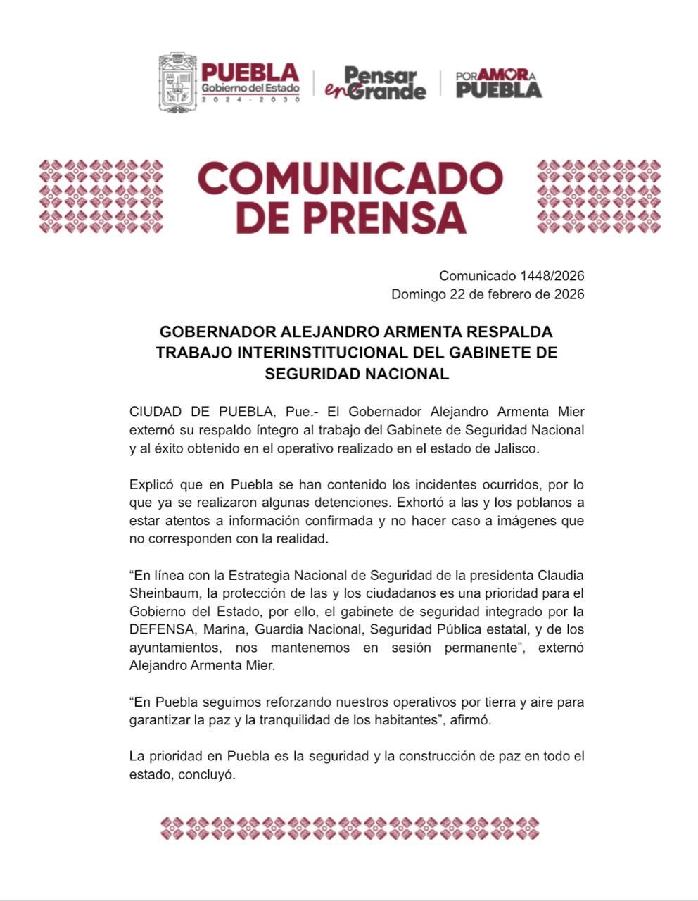 CIUDAD DE PUEBLA, Pue.- El Gobernador Alejandro Armenta Mier externó su respaldo íntegro al trabajo del Gabinete de Seguridad Nacional y al éxito obtenido en el operativo realizado en el estado de Jalisco.