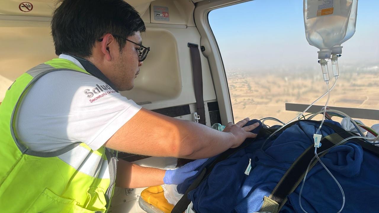 El operativo fue coordinado por el Sistema de Urgencias Médicas Avanzadas (SUMA), a través de una ambulancia aérea, que permitió llegar al nosocomio en solo 15 minutos, tiempo durante el cual permaneció bajo vigilancia, se logró su estabilidad y se disminuyeron los riesgos.