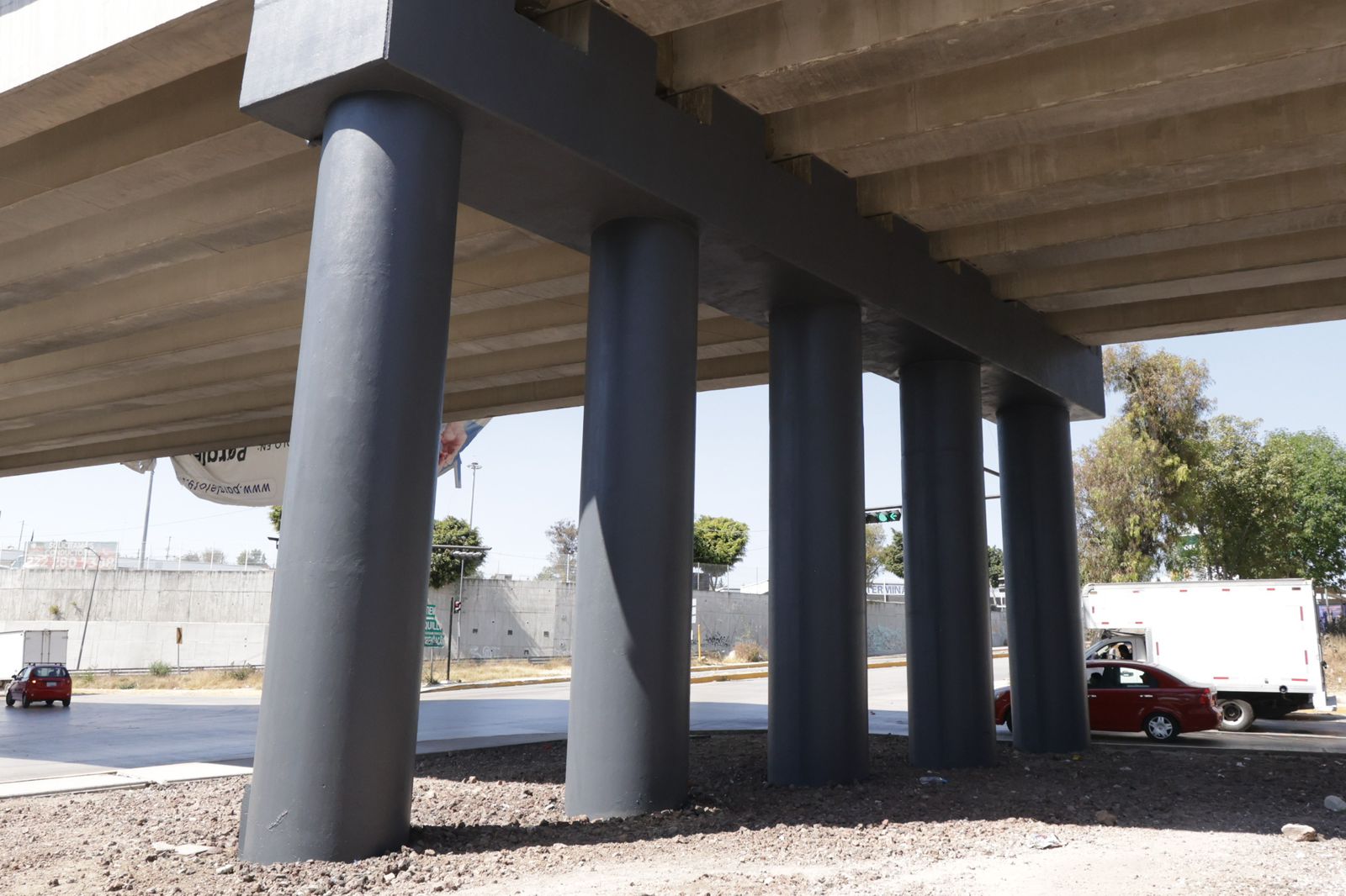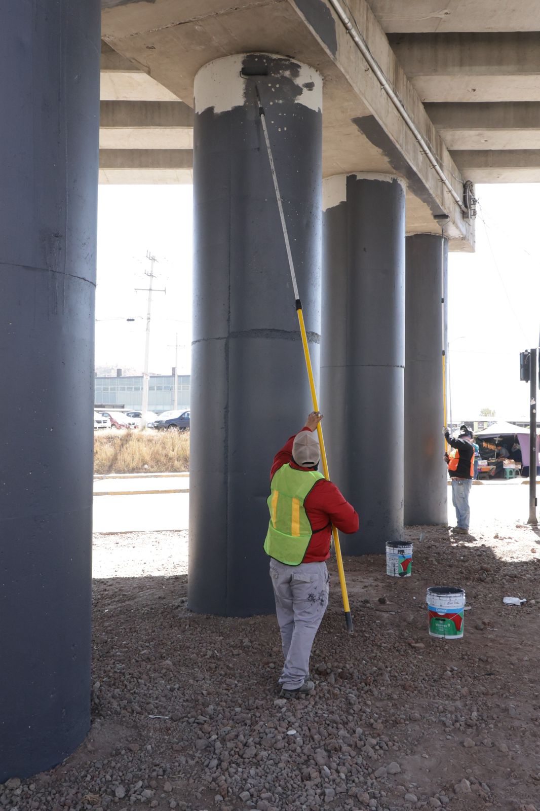 La Secretaría de Infraestructura interviene 23 bajo puentes a lo largo del Periférico Ecológico con cuadrillas que realizan labores como la aplicación de pintura en muros y columnas, diseño de áreas verdes mediante jardinería, instalación de luminarias para mayor seguridad, así como el pintado de guarniciones y rayas divisorias de carriles para mejorar las vialidades.
