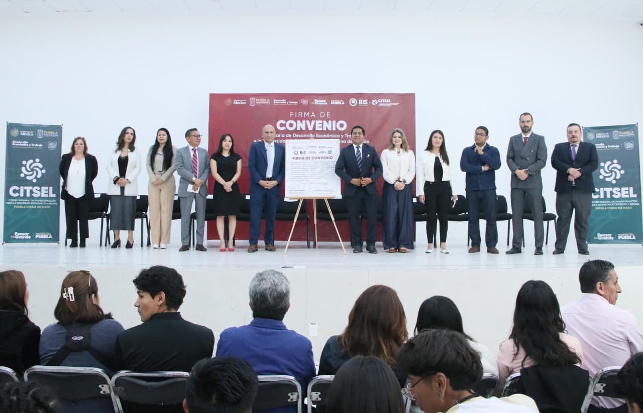 CIUDAD DE PUEBLA, Pue.– Con el propósito de fortalecer la vinculación entre educación superior, empleo formal, así como el desarrollo económico regional, la Secretaría de Desarrollo Económico y Trabajo formalizó la firma de convenio para la instalación del Centro Integral de Transformación y Seguridad Económico-Laboral (CITSEL) Puebla Cinco de Mayo en la Universidad Politécnica Metropolitana de Puebla (UPMP), a fin de acercar servicios estratégicos a la comunidad universitaria y a la población del sur de la capital.