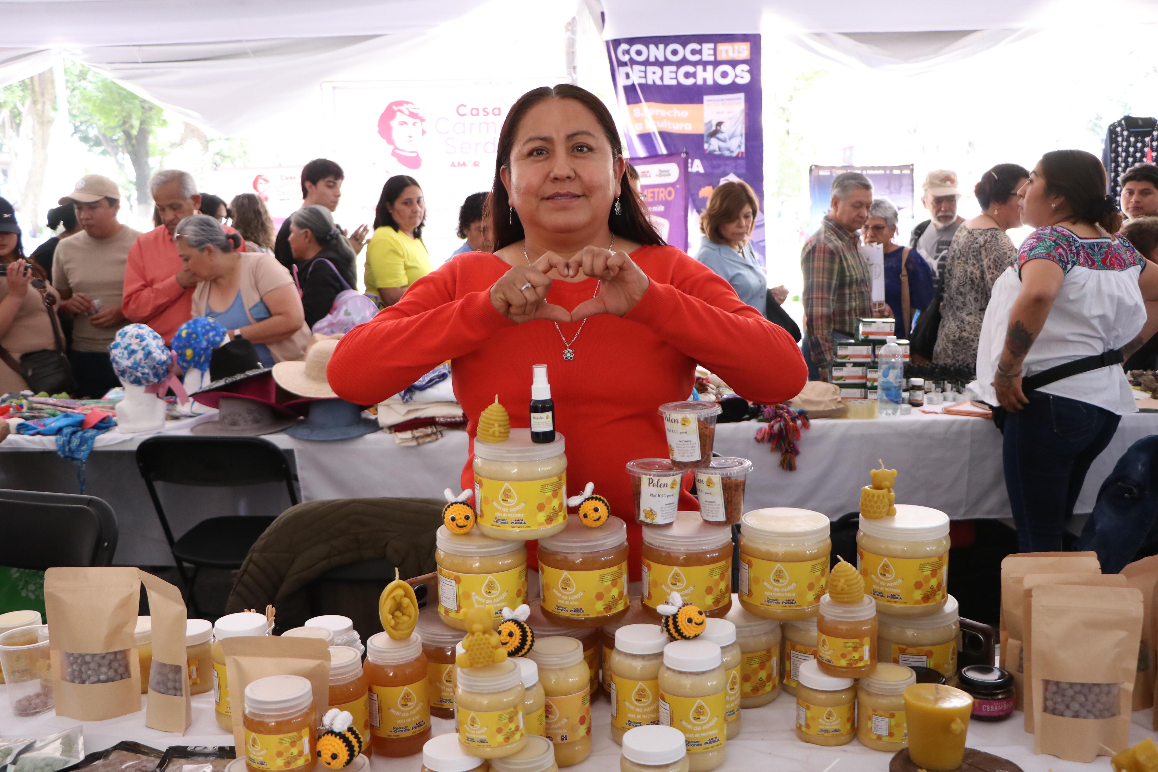 La expositora Beda Ofelia Guzmán Mora señaló que este tipo de encuentros amplían las oportunidades para las poblanas. “Estos espacios nos ayudan a vender nuestros productos, dar a conocer nuestra labor y demostrar que también contribuimos al sustento de nuestras familias”, comentó.
