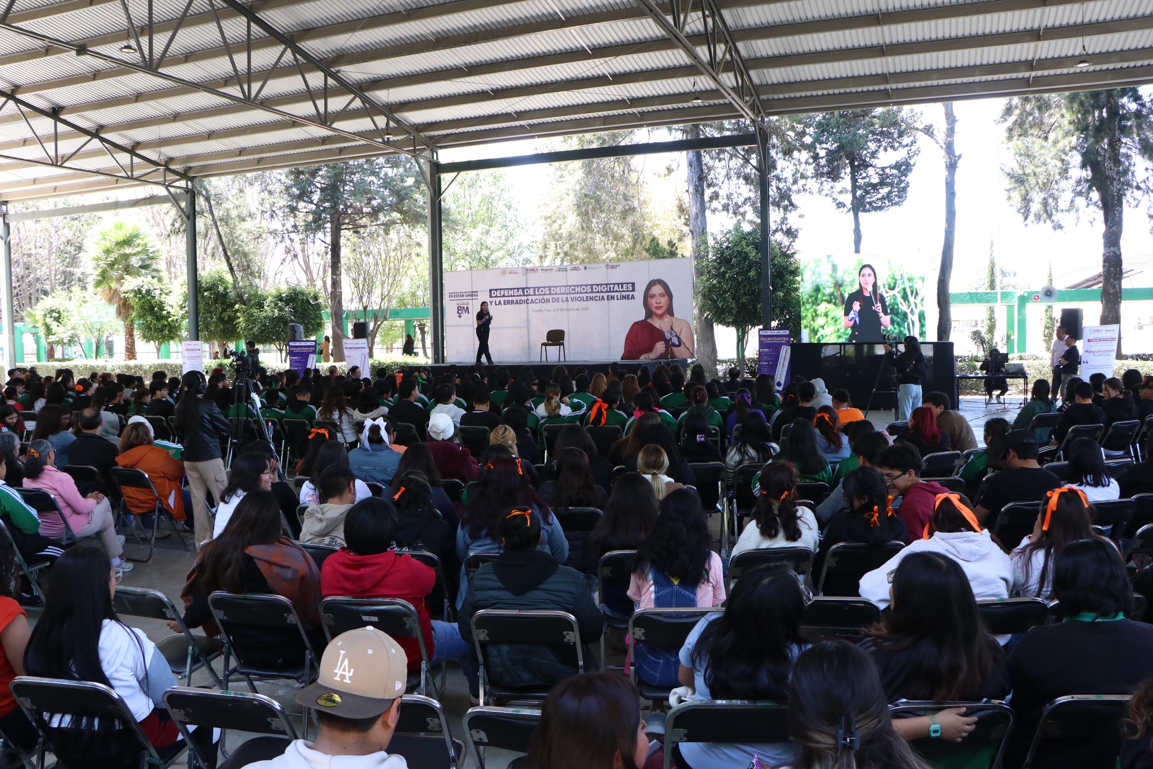En el primer encuentro, más de mil estudiantes del Benemérito Instituto Normal del Estado “Gral. Juan Crisóstomo Bonilla” asistieron a la conferencia “Defensa de los derechos en medios electrónicos y erradicación de la violencia en entornos virtuales”, donde se analizó el impacto de las acciones en redes sobre mujeres, niñas y adolescentes.
